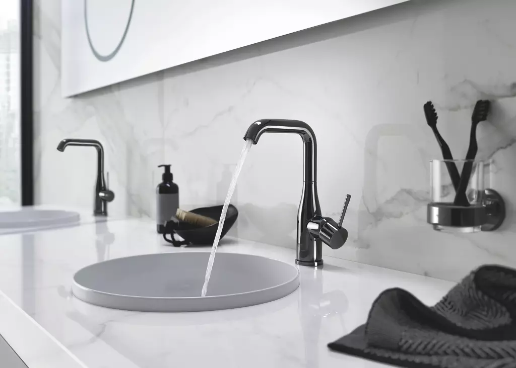The GROHE Essence single-lever basin mixer features SilkMove cold start tap technology to eliminate the possibility of opening the faucet in the mixed hot-and-cold water mode, saving energy by preventing the use of hot water for simple tasks such as washing hands
