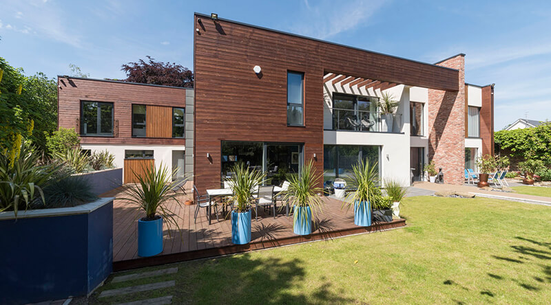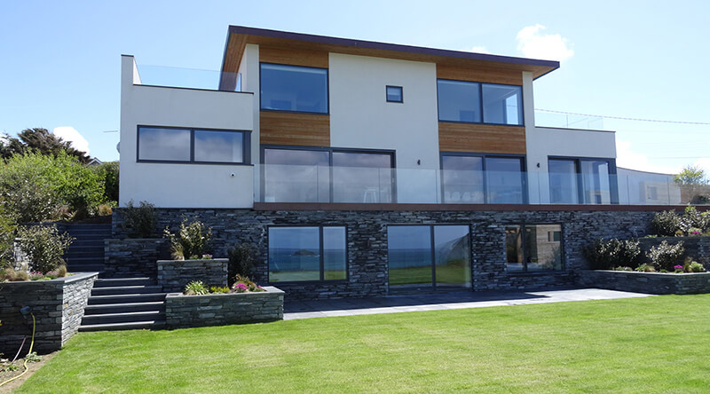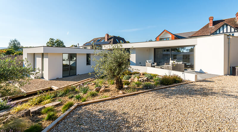 The Passivhaus standard structure incorporates large roof overhangs that protect the walls of the house from the weather and give a lovely sheltered outside area. They also provide solar shading in the summer to prevent overheating.