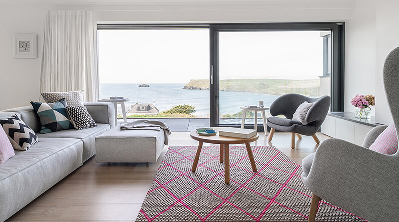 The partition begins at the site entrance, offering glimpses of the stunning outlook through the slot windows that lead to the front door. Inside, the glazed open plan kitchen and living area make the most of the panoramic coastal views.