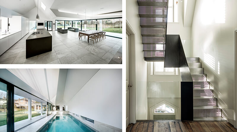 The extension’s pitched gables, clad in zinc, tie in with the original slate roof. An indoor swimming pool runs down the glazed southern facade, which is shaded by a colonnade lined canopy, adding to the feeling of grandeur.