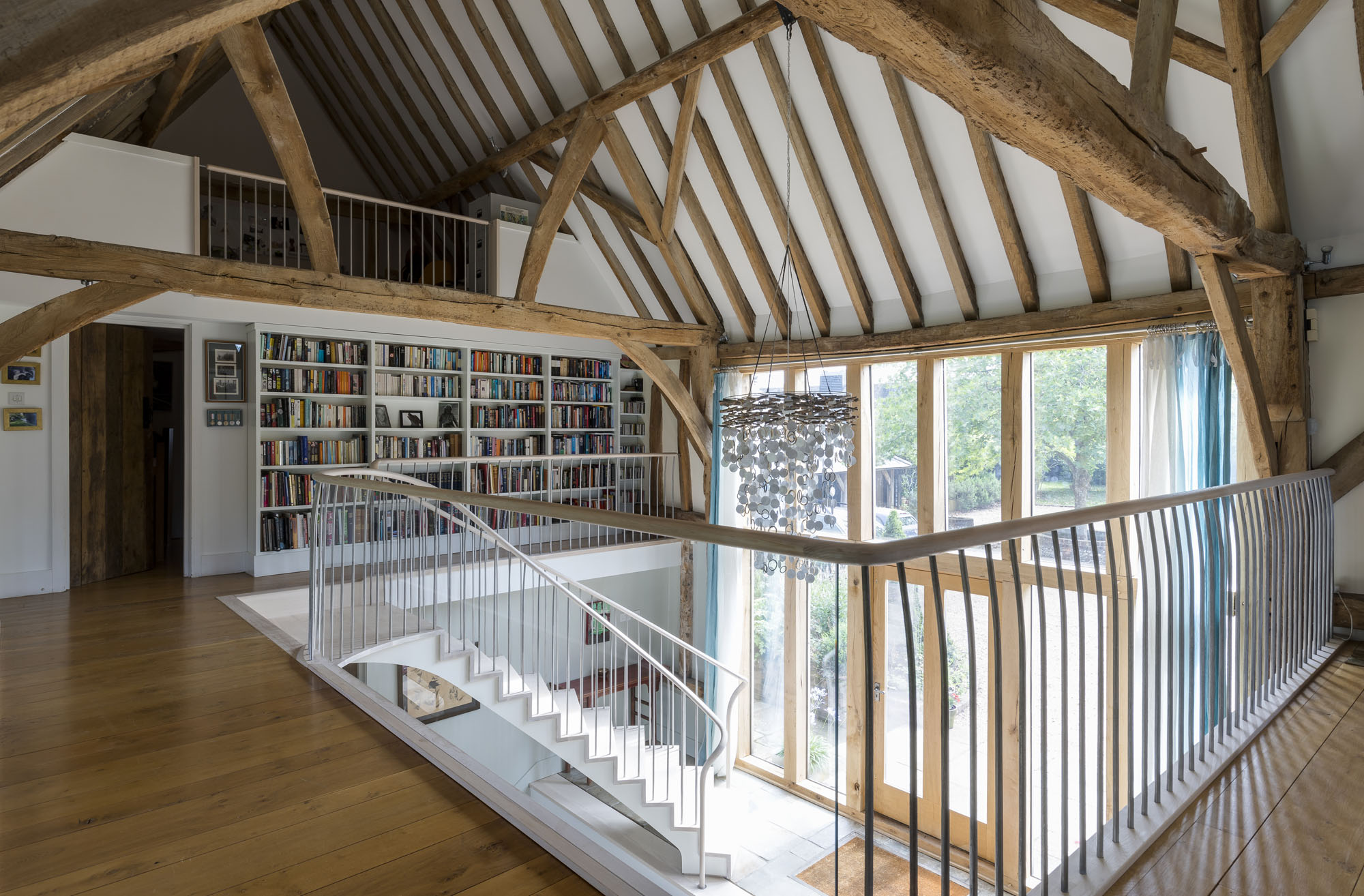 At the head of the staircase is a walkway. So as not to detract from the oak beam detail, at this point the uprights of the staircase give way to a low iron glass balustrade.