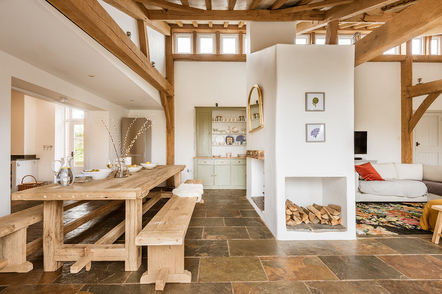 The more spacious sitting room features sling brace trusses and slate flooring, imparting a sense of sophistication and making it an ideal place to unwind by the fire in the evenings. Expansive glazed windows flood the room with natural light during the day, and French doors open directly to the garden. The family room, which extends from the kitchen and dining spaces, is divided by a fireplace and boasts a mono-pitch roof. Outfitted with comfortable sofas and soft furnishings, this room offers a snug, intimate retreat.