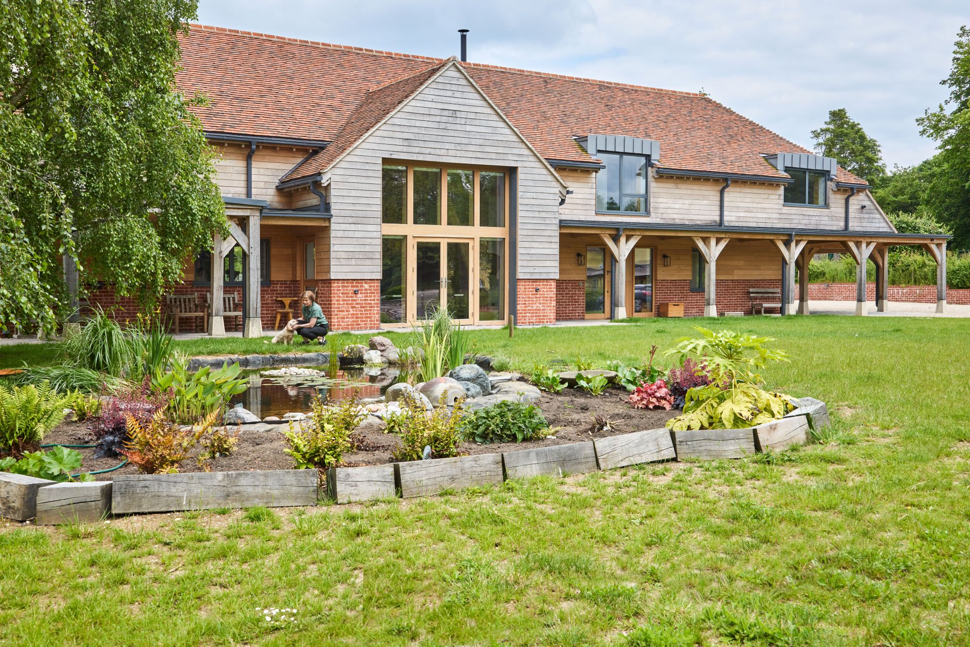 Pond House, in Essex, is a beautifully crafted oak framed home designed for modern living and future comfort. The homeowner, Pauline, had lived in a converted timber-frame barn for 30 years with her husband and children. After being widowed, and with her children grown-up, she decided to build a new, more manageable home on a portion of her current plot, embracing the chance to create a thoughtfully designed, energy-efficient dwelling underpinned by high-quality timber construction. Carpenter Oak worked with Pauline and her architect to deliver a bespoke structural frame, giving the new home character, solidity and longevity.