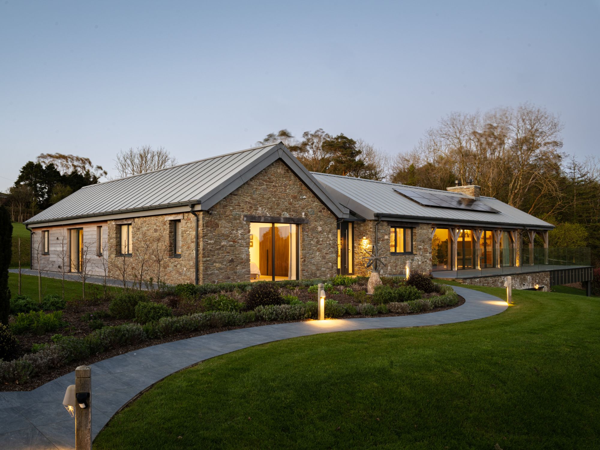 BBH Architects have deliberately ensured that the frame is a visible feature on the exterior, incorporating a succession of oak posts resting on granite saddle stones, which harmonise perfectly with the home’s external finishes, including stone cladding and a sophisticated zinc roof. To the east, two more trusses extend, seamlessly transitioning into a covered area designed for outdoor dining and entertaining. Attention to detail is evident throughout the property, which was expertly constructed by local builder Martin Joyce. Notable features include a striking glass entrance set neatly between sections of the zinc roof, a protected courtyard garden offering tranquillity and privacy, and sections of cedar cladding that adorn some of the external walls, adding warmth and texture to the overall design.