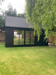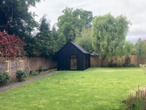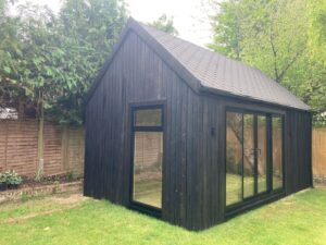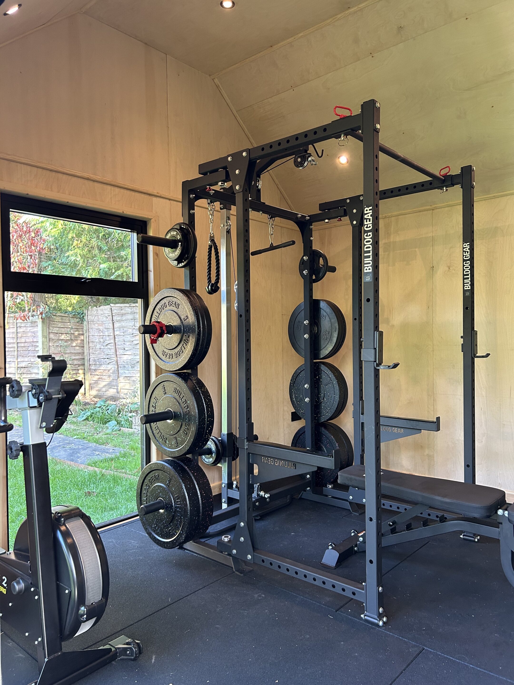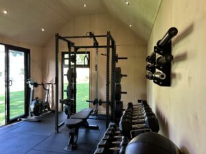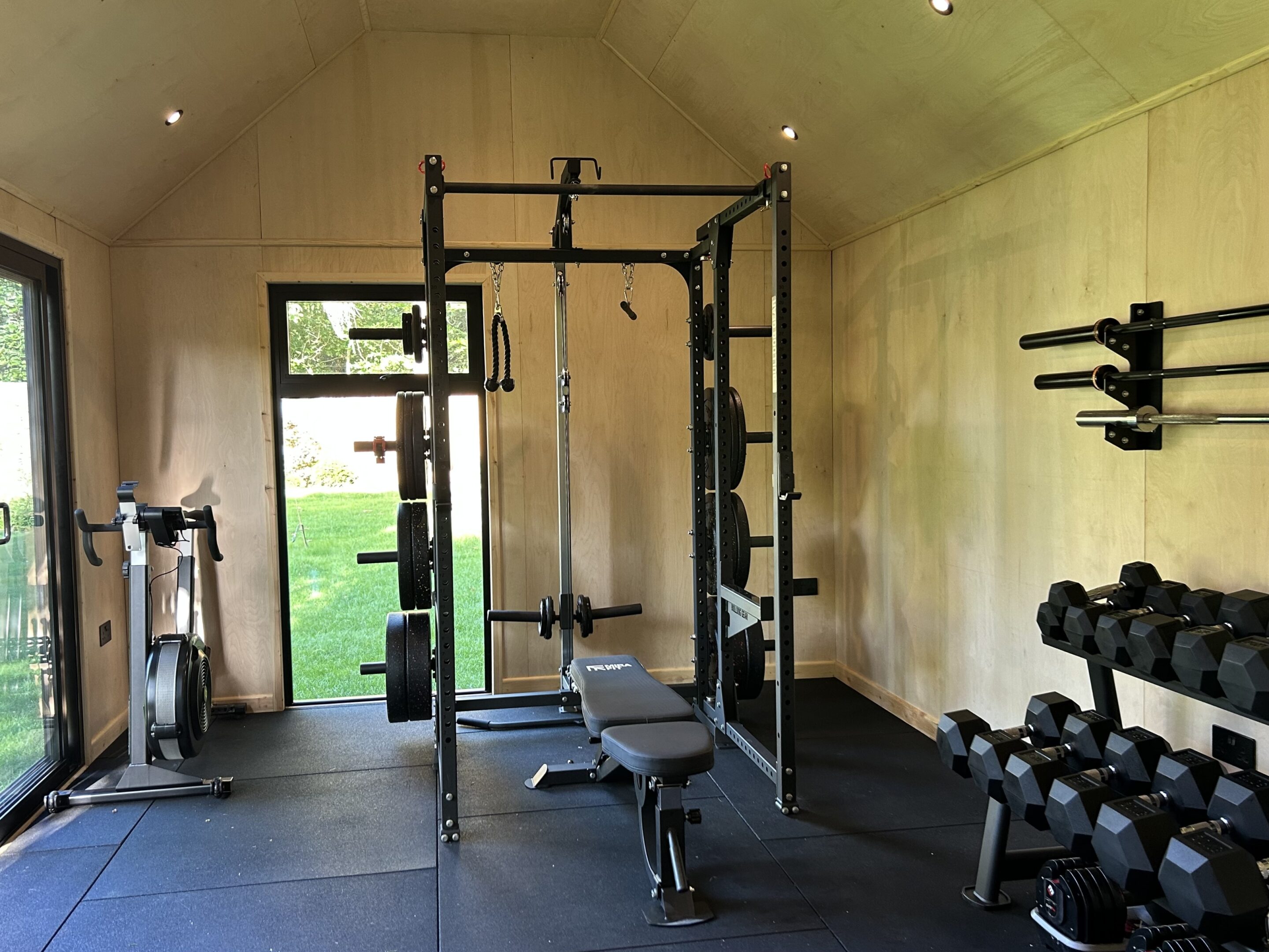 This garden room in Guildford is a bespoke home gym, built to the client’s exact specifications. Measuring 5.8m by 3.6m, 21.9m² of internal space. The apex roof reaches 4m externally, creating a vaulted ceiling of 3.4m internally, which ensures an open and uncluttered environment suitable for a full range of gym equipment and movement.