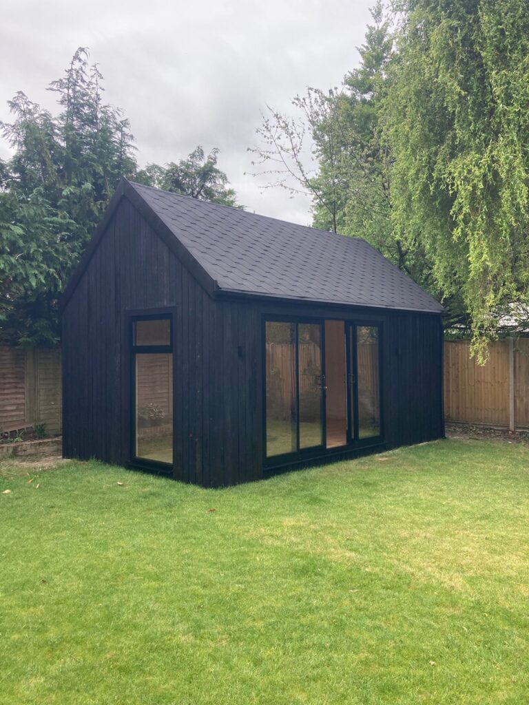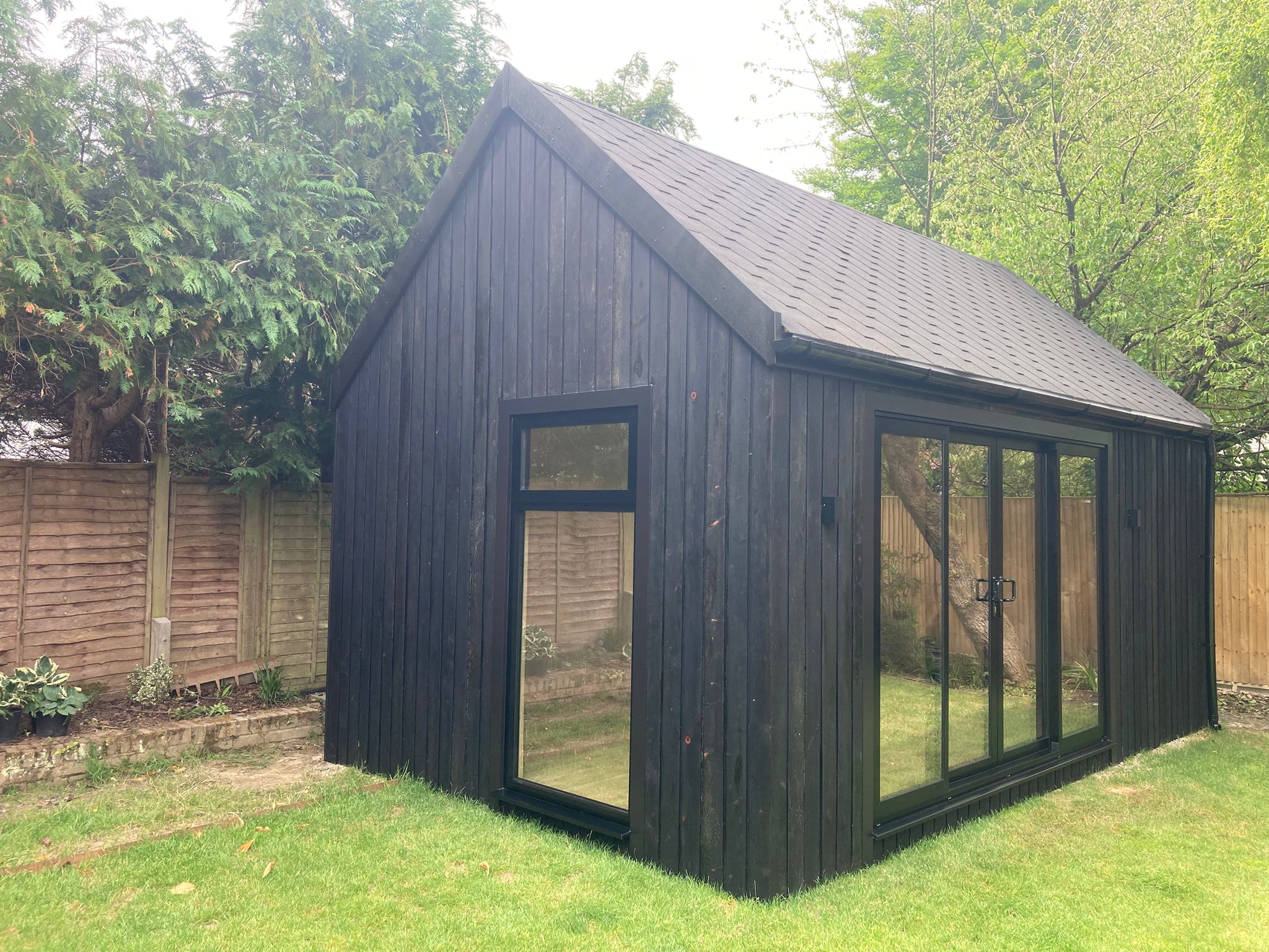 Externally, the front and left elevations are clad in charred larch using the Shou Sugi Ban technique, a traditional Japanese method that chars the timber surface to improve weather resistance and durability while providing a textured black finish. Less visible areas are clad in black composite materials to reduce maintenance and cost. The roof is finished with black shingles, and a canopy accommodates customer-supplied external spotlights.