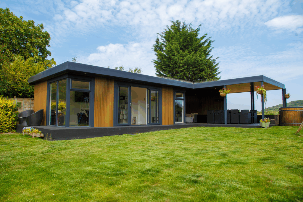 Work began with ground preparation, levelling the site and installing water and waste connections for the shower room. The main building measures 7.7m x 4.2m and is finished in vertical composite spiced cedar cladding, with anthracite Hardie Plank on the less visible elevations. Anthracite UPVC windows and doors complete the exterior.