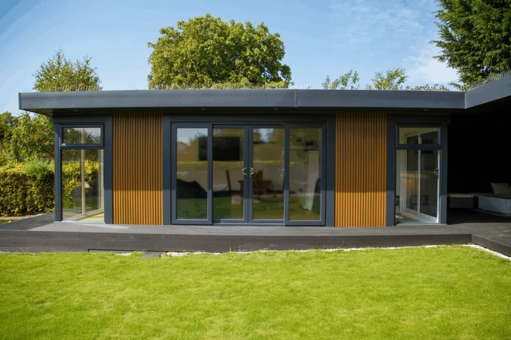 This bespoke L-shaped garden room combines a home office with a versatile entertainment and family space. Measuring 30m² internally, the building includes a shower room and an additional 30m² canopy area that extends the living space outdoors.