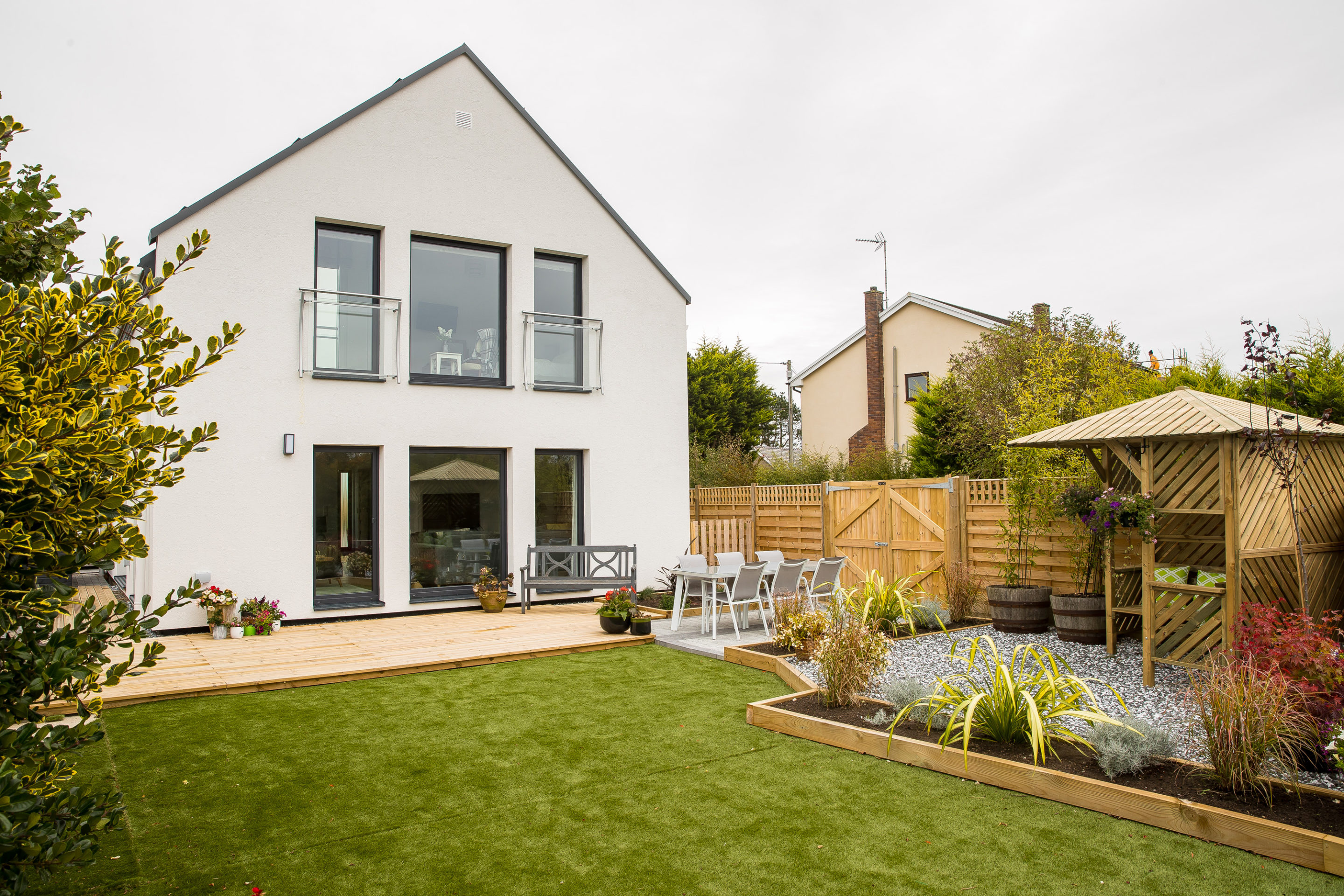 They were lucky to have a large garden that they were able to split, still leaving space to build a 147.7m2 Dan-Wood Living Point 150E.