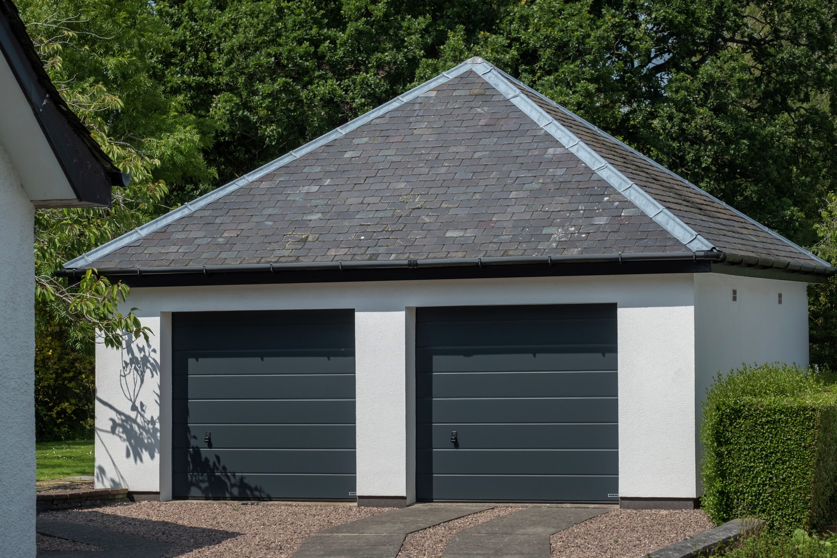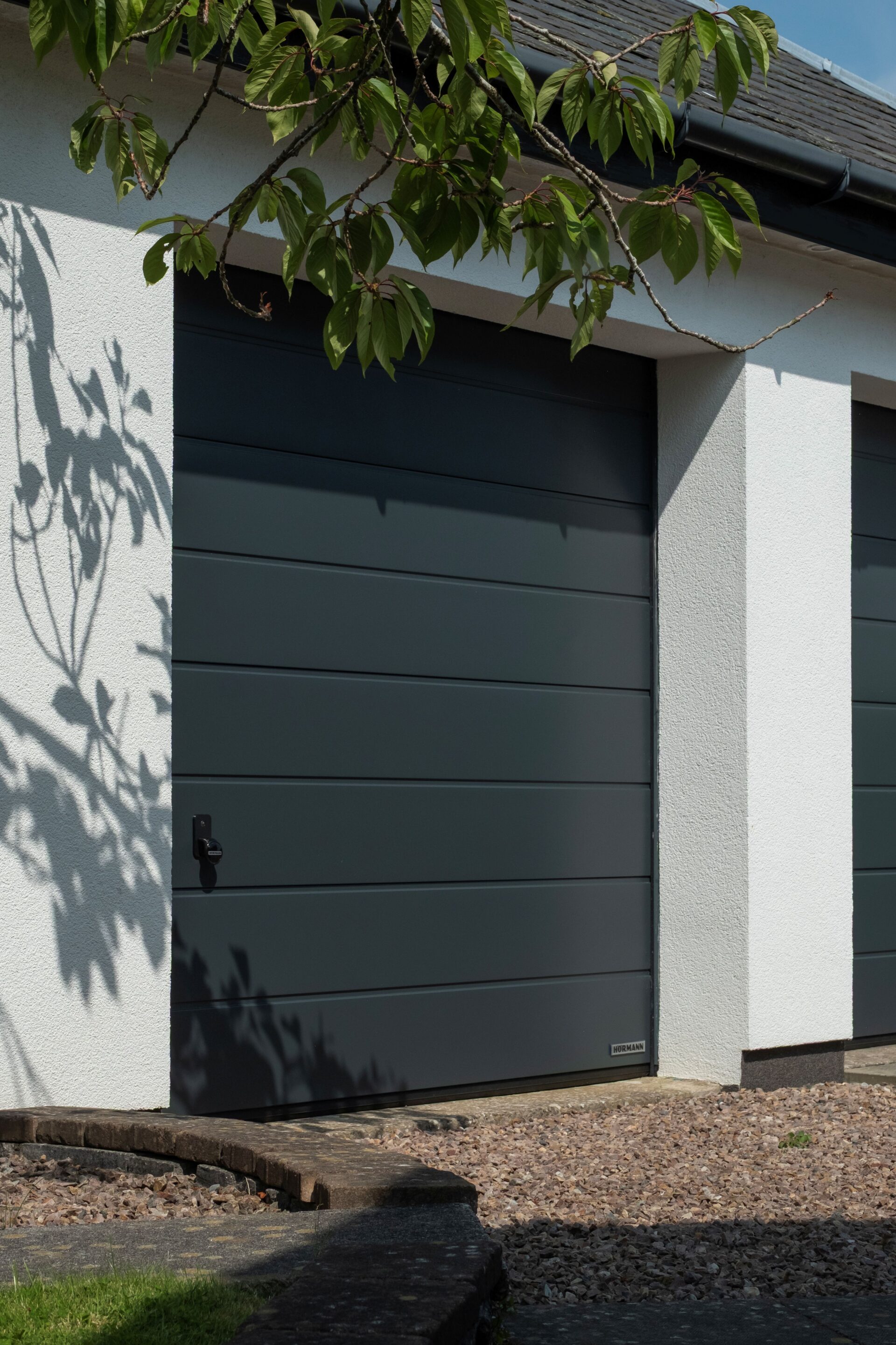 A recent installation in Dundonald, Kilmarnock featured two LPU 42 PremiumPlus doors, replacing the property’s previous garage doors that had suffered visible wear due to the proximity of the coast. Hörmann replaced them with two smart matching Anthracite grey (RAL 7016) M-rib Silkgrain sectional doors, each measuring 2286 x 2125mm. One was fully automated for frequent use, while the second was manually operated, both being equipped with matching handles to maintain a consistent aesthetic.