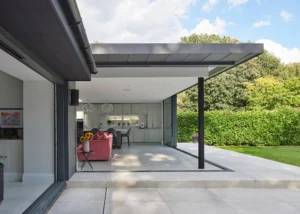 Large glazed sliding doors from IDSystems allow for open corners on this impressive modern addition