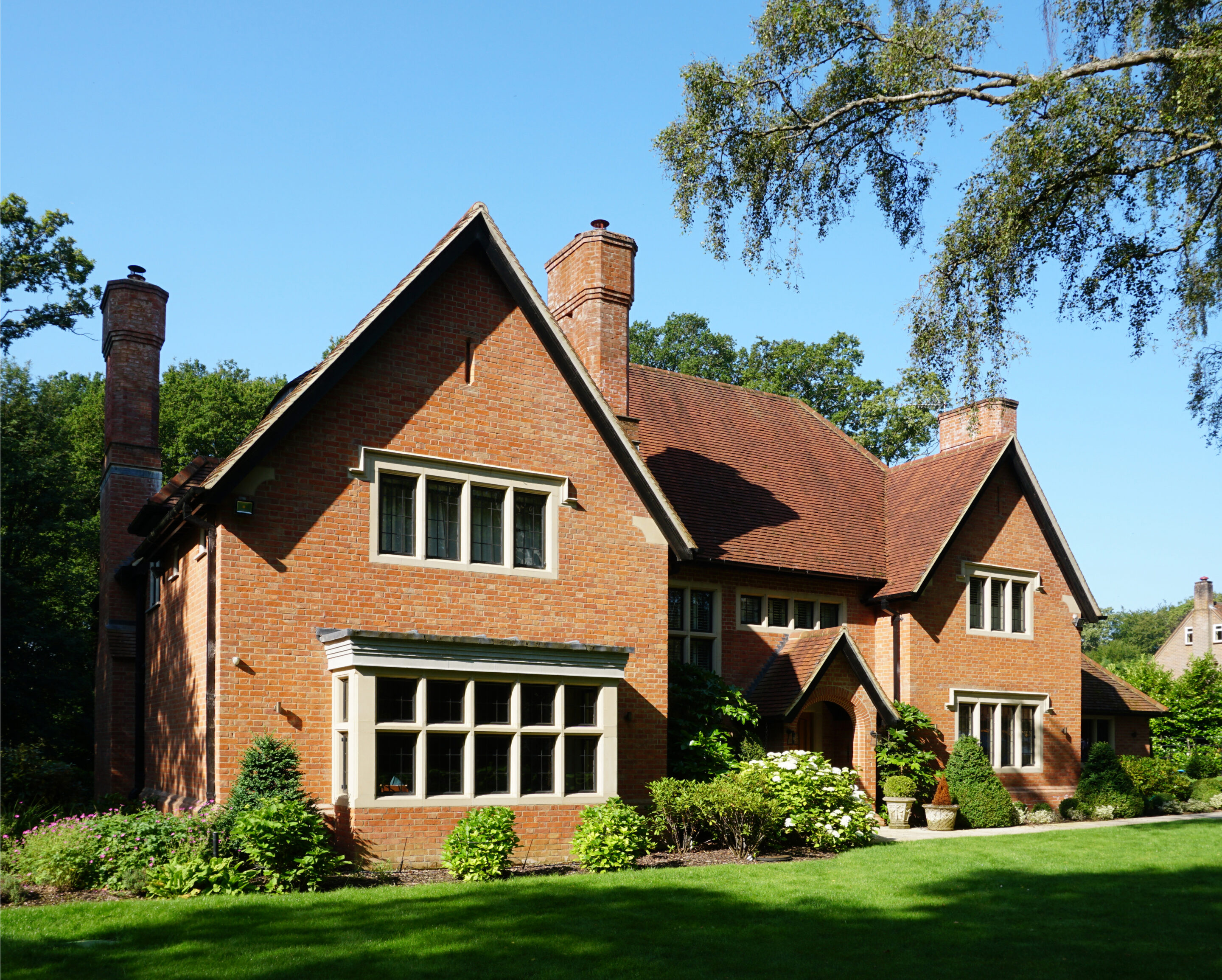 When owner Sarah Jones replaced an existing run-down 1930s building on the site, she wanted to create an authentic Arts & Crafts house, with a steeply pitched roof, low eaves, wide overhangs, large chimney stacks, and a prominent front porch.