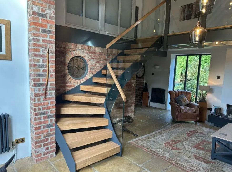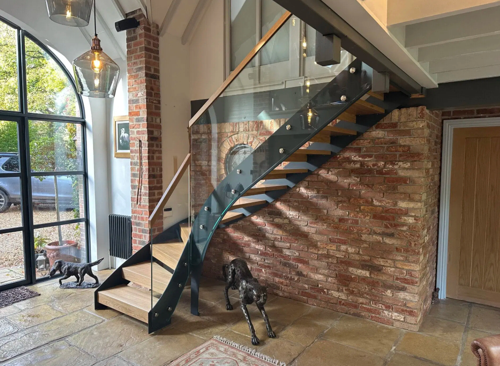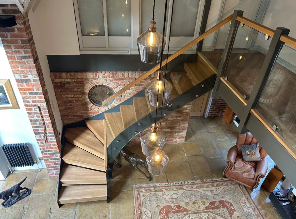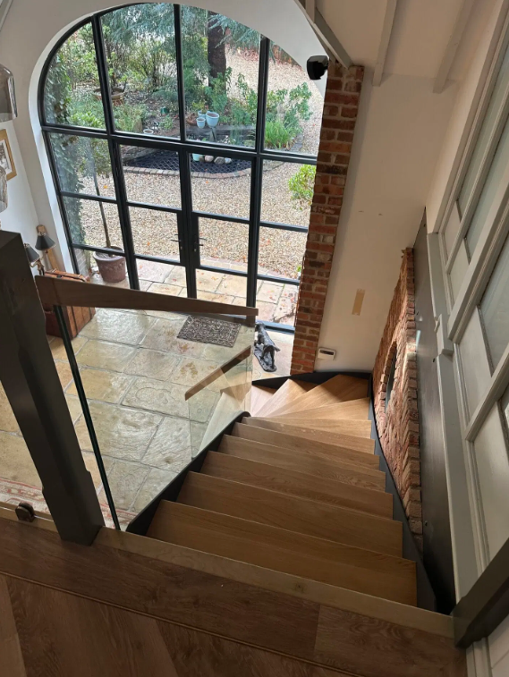 Beyond its aesthetics, every detail is engineered for safety and comfort. From the carefully calculated rise and going to the handrail height and winder geometry, the staircase is fully compliant with UK Building Regulations.