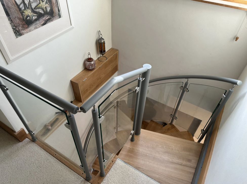 To maintain an open feel, we incorporated curved toughened glass balustrades and matching half-risers. These offer safety and stability while allowing light to pass through, preserving the cottage’s bright and welcoming atmosphere. The powder-coated posts and curved handrail continue the clean, cohesive design, completed with precisely cut 10mm toughened glass infill panels for clarity and durability.