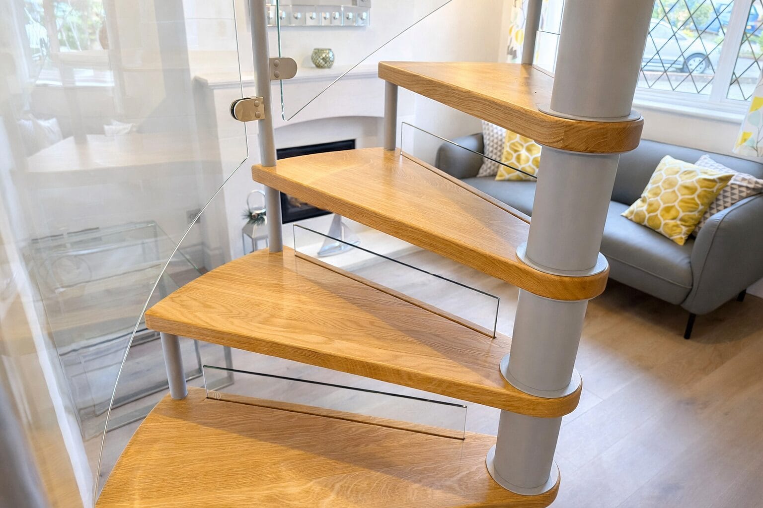 Material choices enhance both performance and aesthetics. Solid oak treads introduce warmth and character, complemented by a slim, powder-coated steel structure. Curved toughened glass balustrades and half risers maximise light flow while maintaining safety, with a continuous handrail following the elegant line of the spiral.