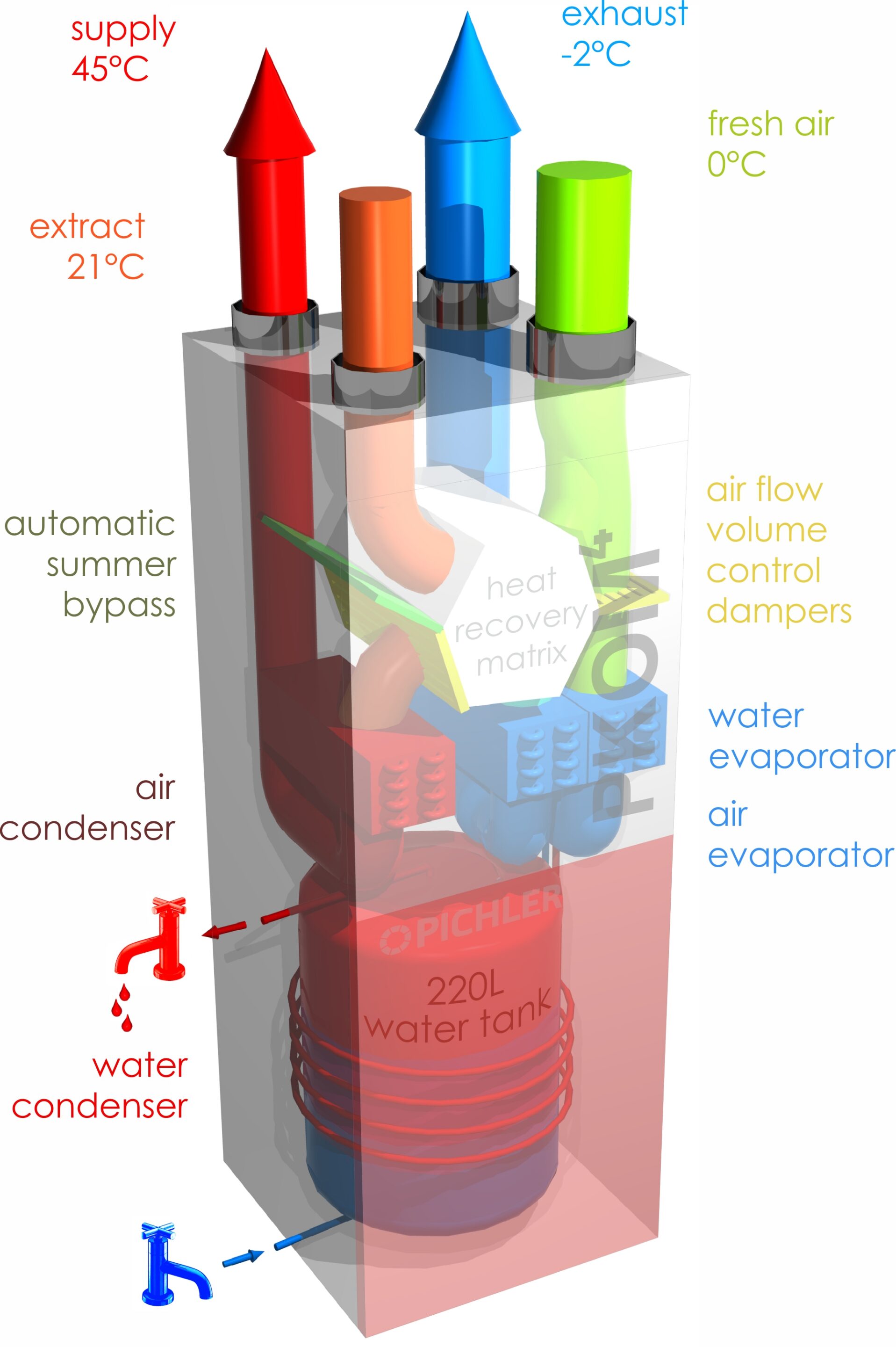 This compact service unit provides heat recovery ventilation, with an integral heat pump for warm air to be introduced to your habitable rooms, via the ventilation ductwork. The heat pump can be reversed to provide cooling as well, great for those warmer summer nights when you could sleep better with a 4-5°C temperature reduction. There is a second heat pump within the PKOM 4A unit to provide domestic hot water in a 212L/ 220L tank underneath, making it the only compact service unit of its kind. This heating and ventilating system can be up to 680% efficient in comparison to a gas boiler at only 90% efficiency.