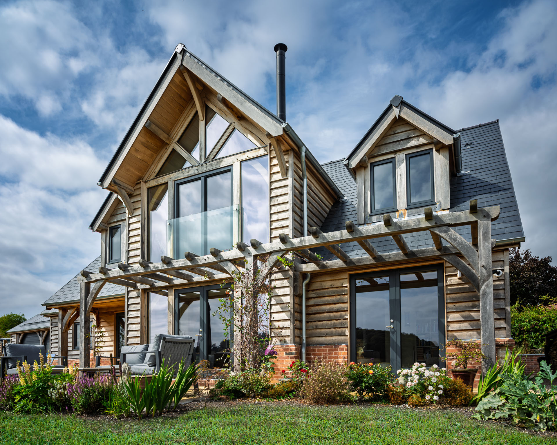 Mark and Sarah moved into their new home nineteen months after they first broke ground. Their oak frame is a simple contemporary design where post and beam structures zone downstairs rooms and double height grandeur is seen in the stairwell and their bedroom. The 165m² house is clad in oak with slate tiles while the plinth of new bricks has an appropriately aged appearance.