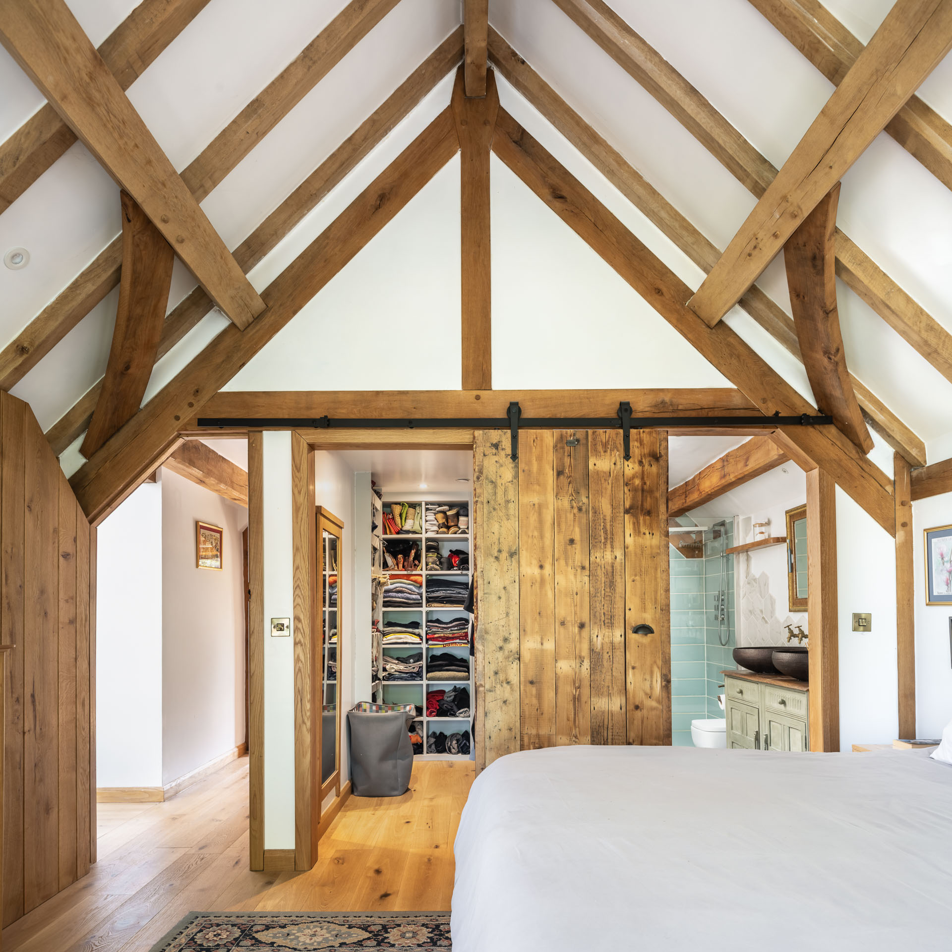 The design features a double height entrance hall with an oak staircase. A cloakroom and cupboard are concealed beneath the stairs, and downstairs is largely open-plan and zoned with a mix of slate flooring and wood. Upstairs, bedrooms have vaulted ceilings and there’s oak in the bathrooms too. Their oak frame design proved to be a resounding success with the local planning authority because of its sympathetic appearance on the historical site.
