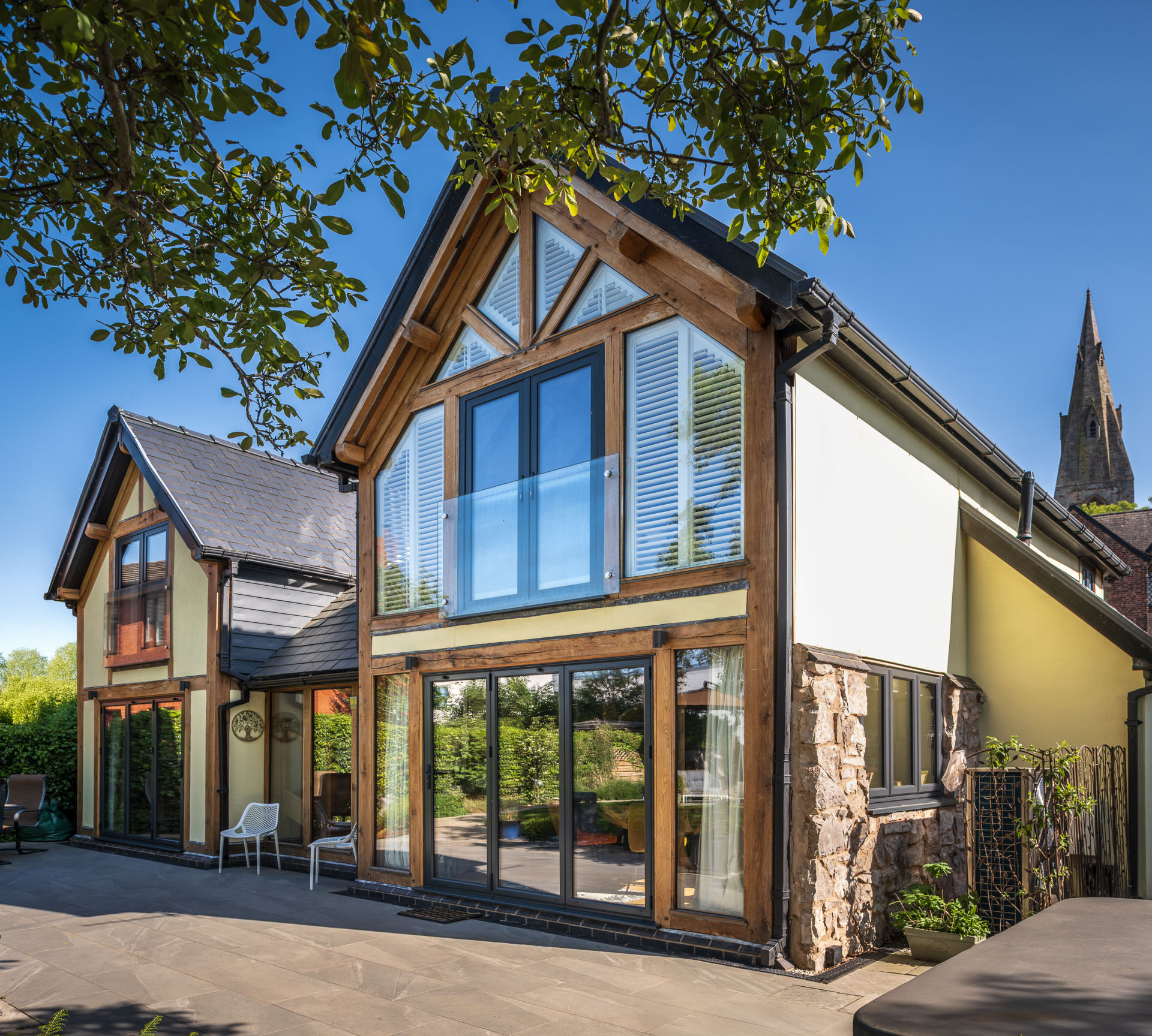 BOOK HEREAn oak frame house became the perfect choice for Moira and Tony Cain who bought a neglected, overgrown plot in Denbighshire which was once the walled garden to a Grade II listed church next door. They bought the land with outline planning permission for a red brick house in a similar design to the vicarage next door and the sheltered housing on the other side which they were keen to change. They felt a red brick house wouldn’t blend in with the old timber frame buildings in the town. An oak frame house seemed much more in keeping but they knew that being on a historical site, gaining planning permission may be difficult. The couple investigated building with oak frame and discovered what they thought might be an expensive way to build was actually within their budget.