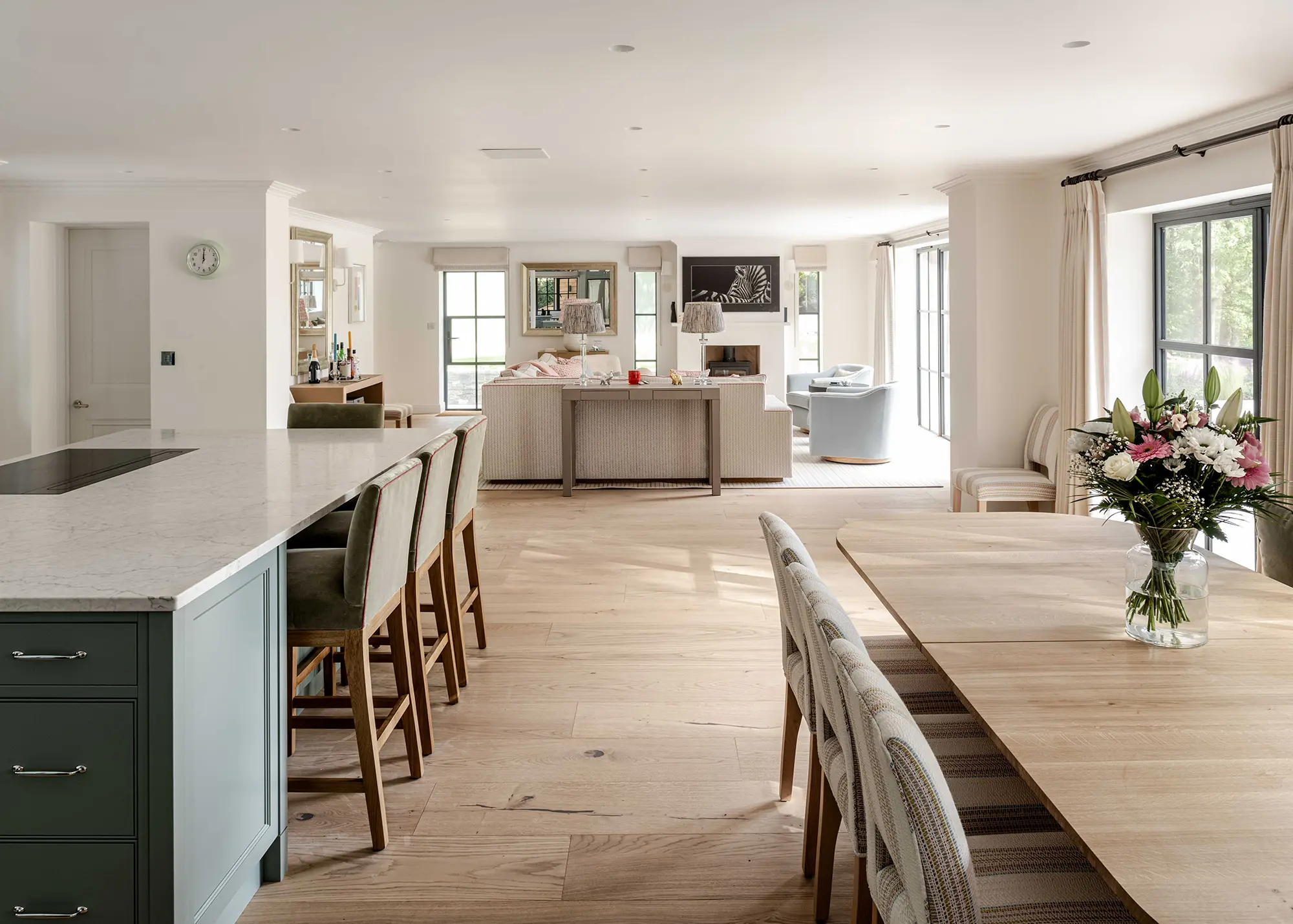 It works beautifully in open-plan areas thanks to its ability to create a cohesive, unified transition between spaces. Due to the high thermal mass of the material, underfloor heating is an excellent partner to a concrete floor, which will hold onto warmth for a long time. To achieve a high-quality and lasting finish, any concrete floor should be poured and polished by a professional.