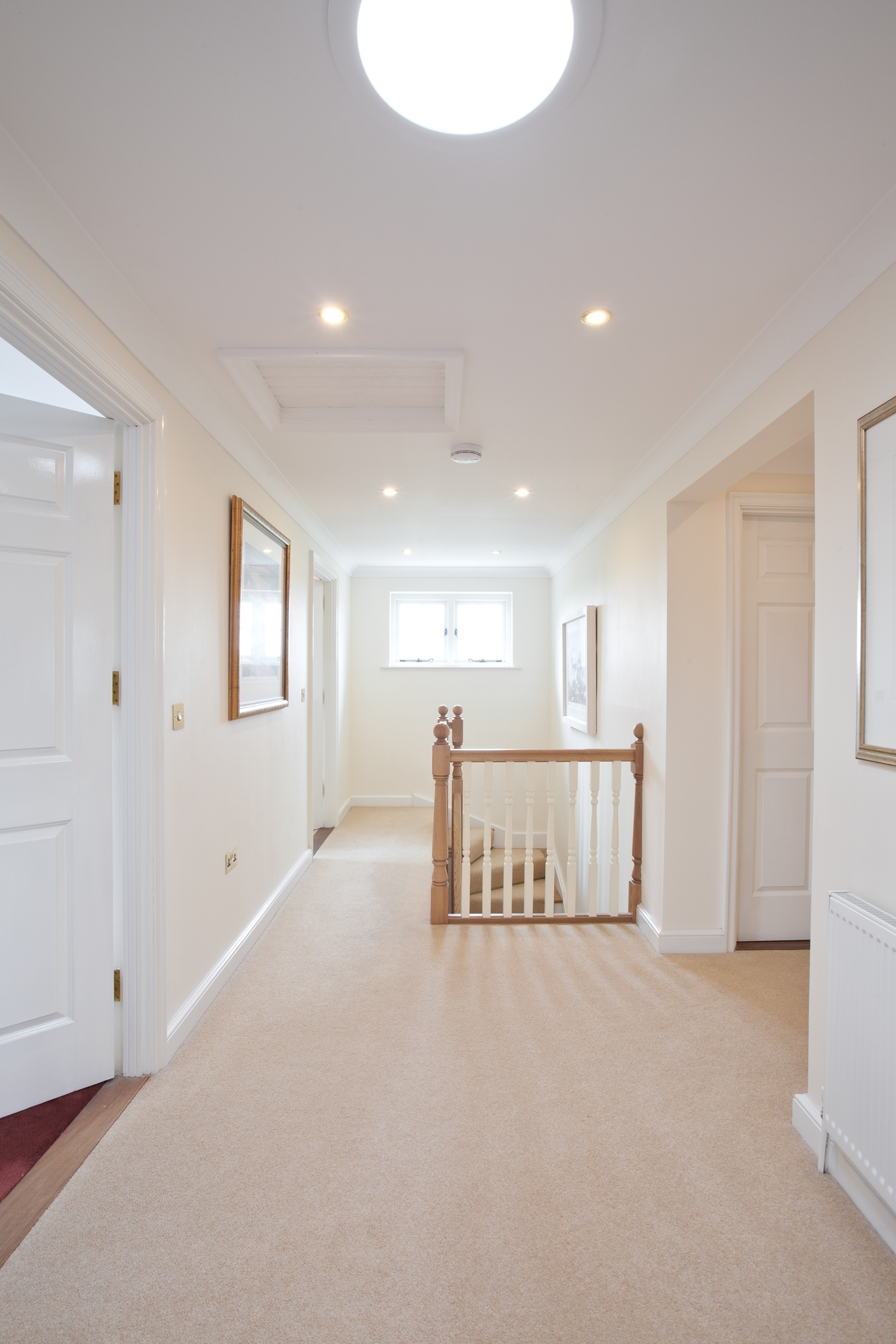 As you enter the house you’re welcomed by a spacious hallway with a large living room ahead, the children’s playroom to the right and a formal dining area to the left. Next to this is the large kitchen/diner and utility. A glazed sunroom links this part of the house to the garage, which has a study and cinema room above. Upstairs in the main house are four double bedrooms and a master with ensuite, as well as a large family bathroom.