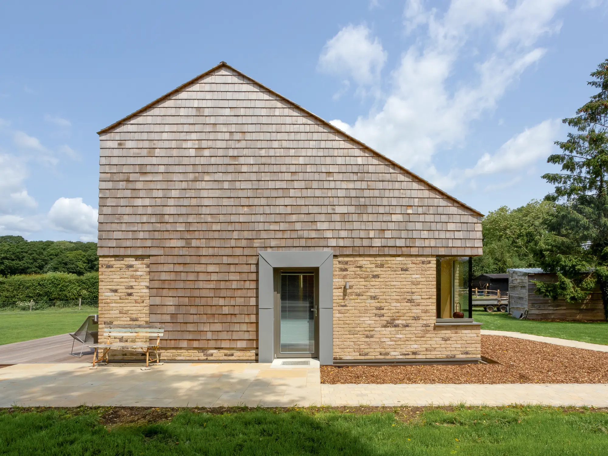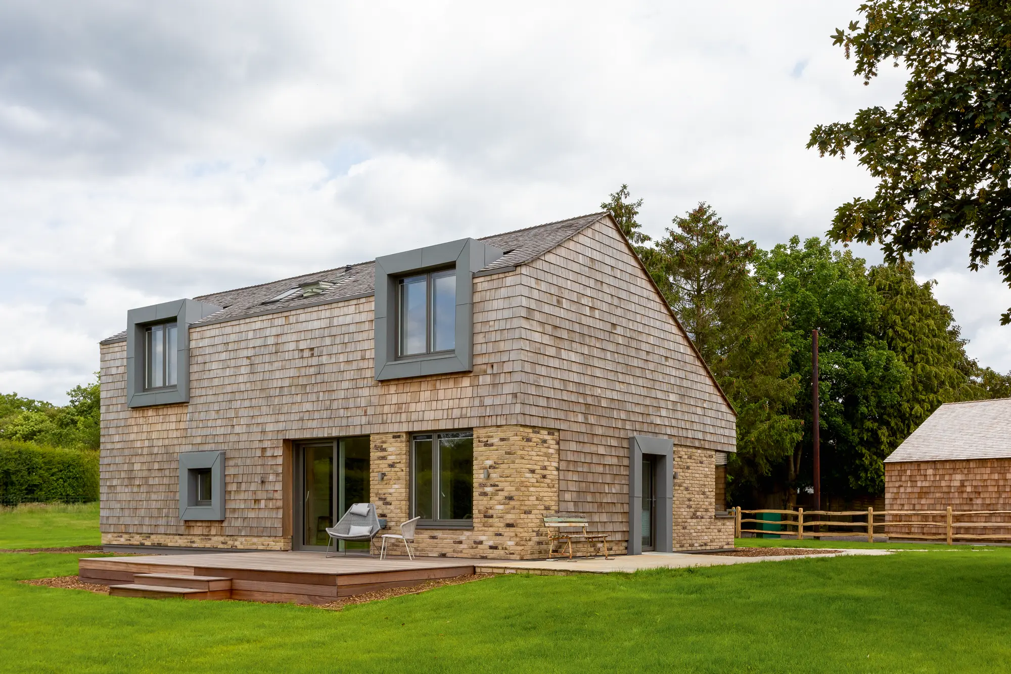 The majority of the house is finished in cedar shingles, with sections of the ground floor and the base featuring pale brickwork for a modern aesthetic
