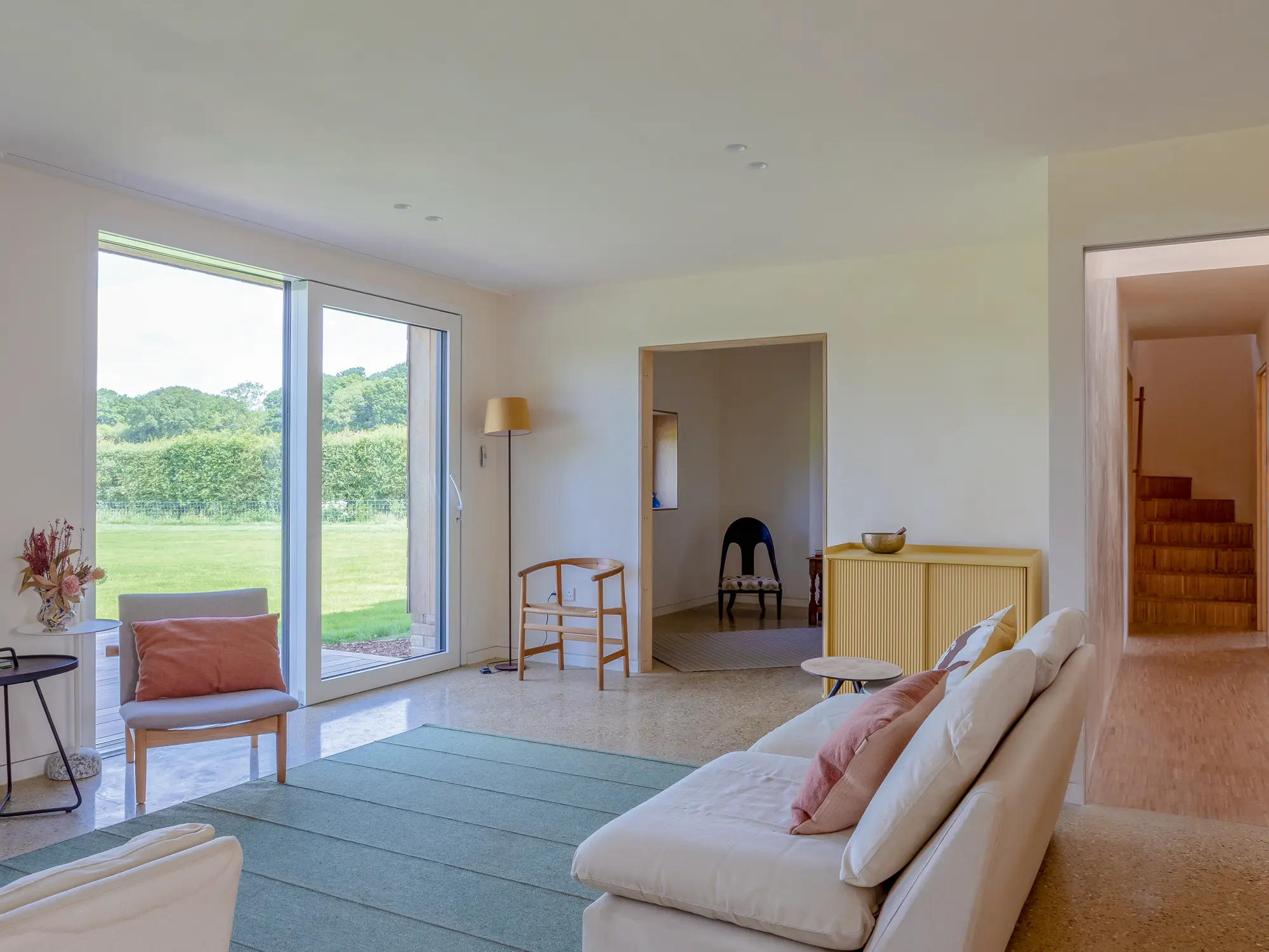 The light-filled living room, open to the kitchen-diner, enjoys views through sliding doors. A cosy snug is accessible via double pocket doors