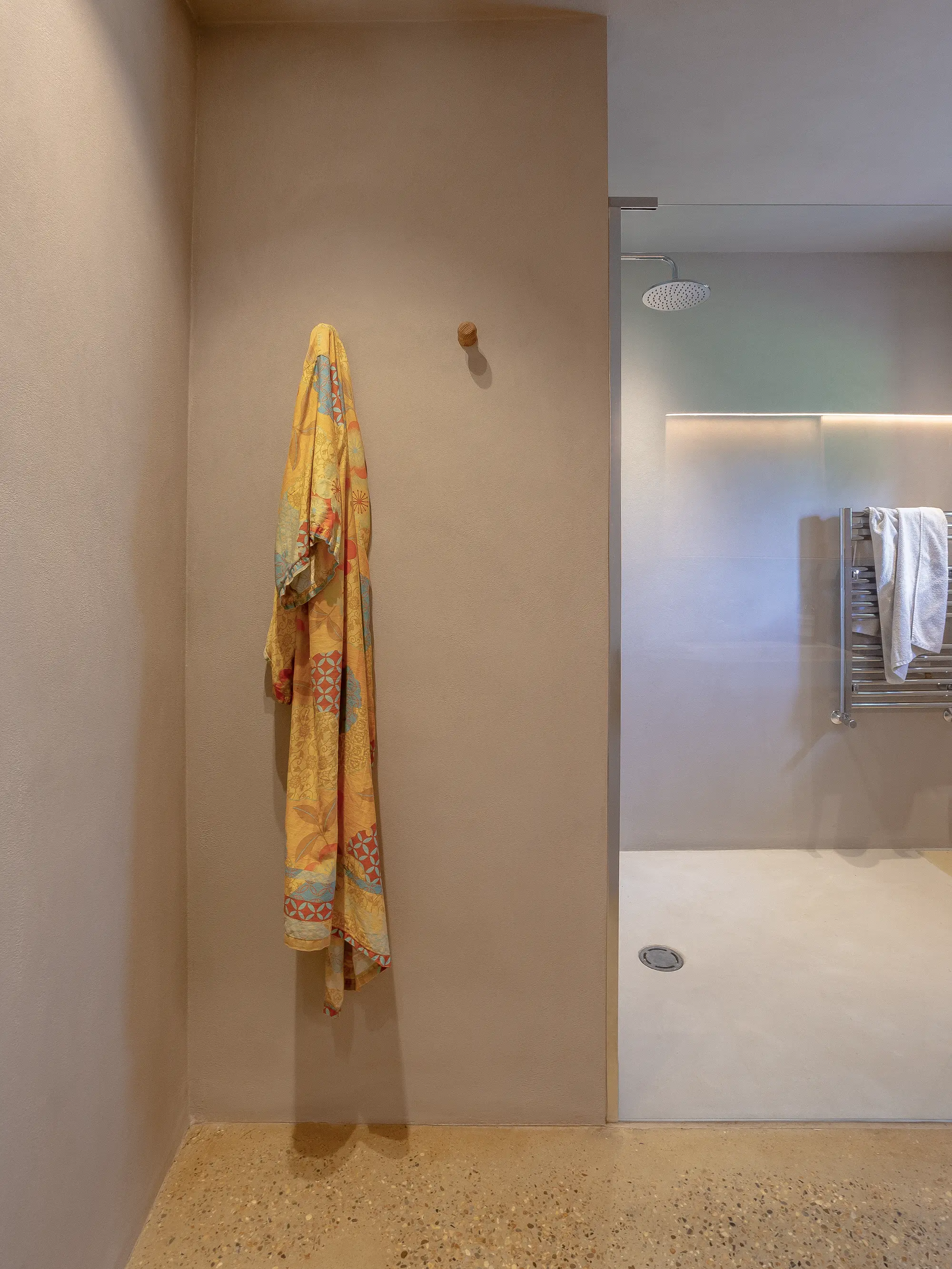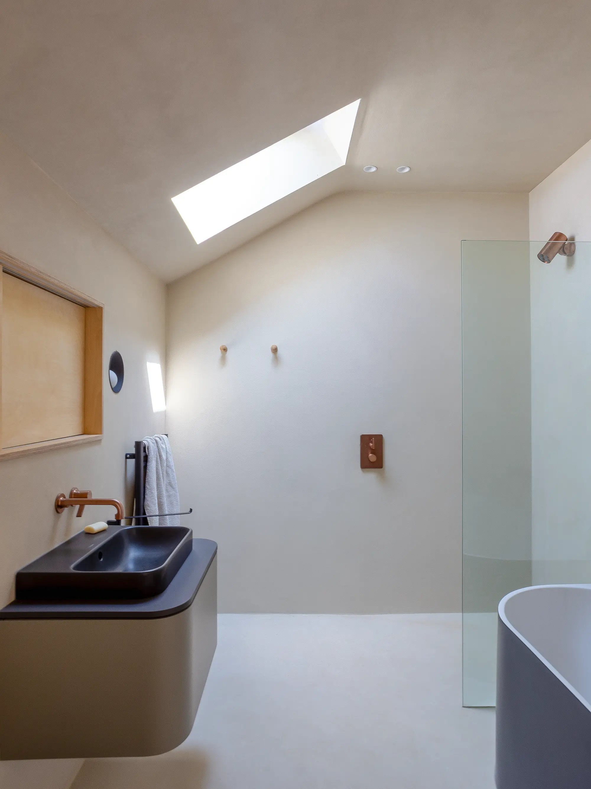 Warmth is provided by an air source heat pump, hooked up to the underfloor heating downstairs and radiators upstairs, which she’s not needed to use since moving in. Solar panels provide much of the electricity. “In the cooler months, I might have to put the underfloor heating on for an hour a day, but that’s enough to permeate throughout and keep the place warm,” she says.