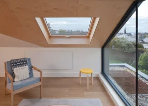 A long linear rooflight leads from the new entrance through a small snug, directly into the large extension, where the kitchen-diner opens up to the garden. The staircase comes off from here and works with the slope of the roof to access the upstairs living area.