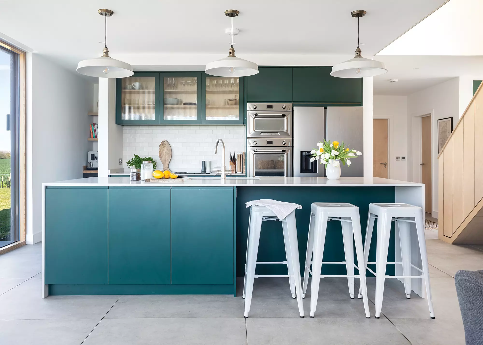 Dark teal handle-free units are crisply outlined with white tiles and worktops in the kitchen