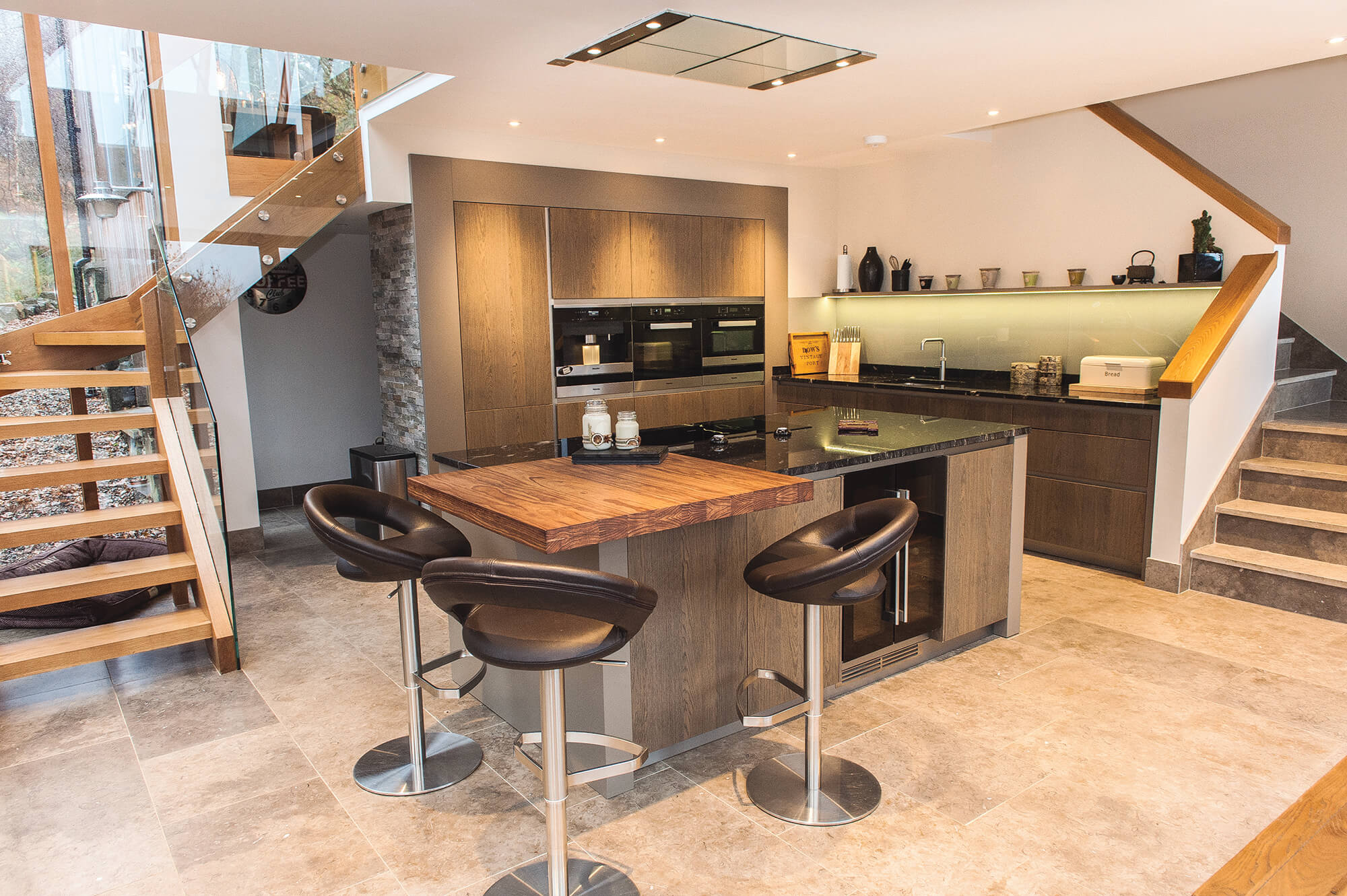 One such example is the bespoke oak staircase, which was originally going to lead from the kitchen out into the living room. “When we started to lay it out on site, we realised that if we widened the kitchen and put the staircase at the edge of the space in an atrium, then it would be more interesting because you get the sensation of going outside when moving between storeys,” says Joe. “The result is fantastic; it’s a piece of art.”