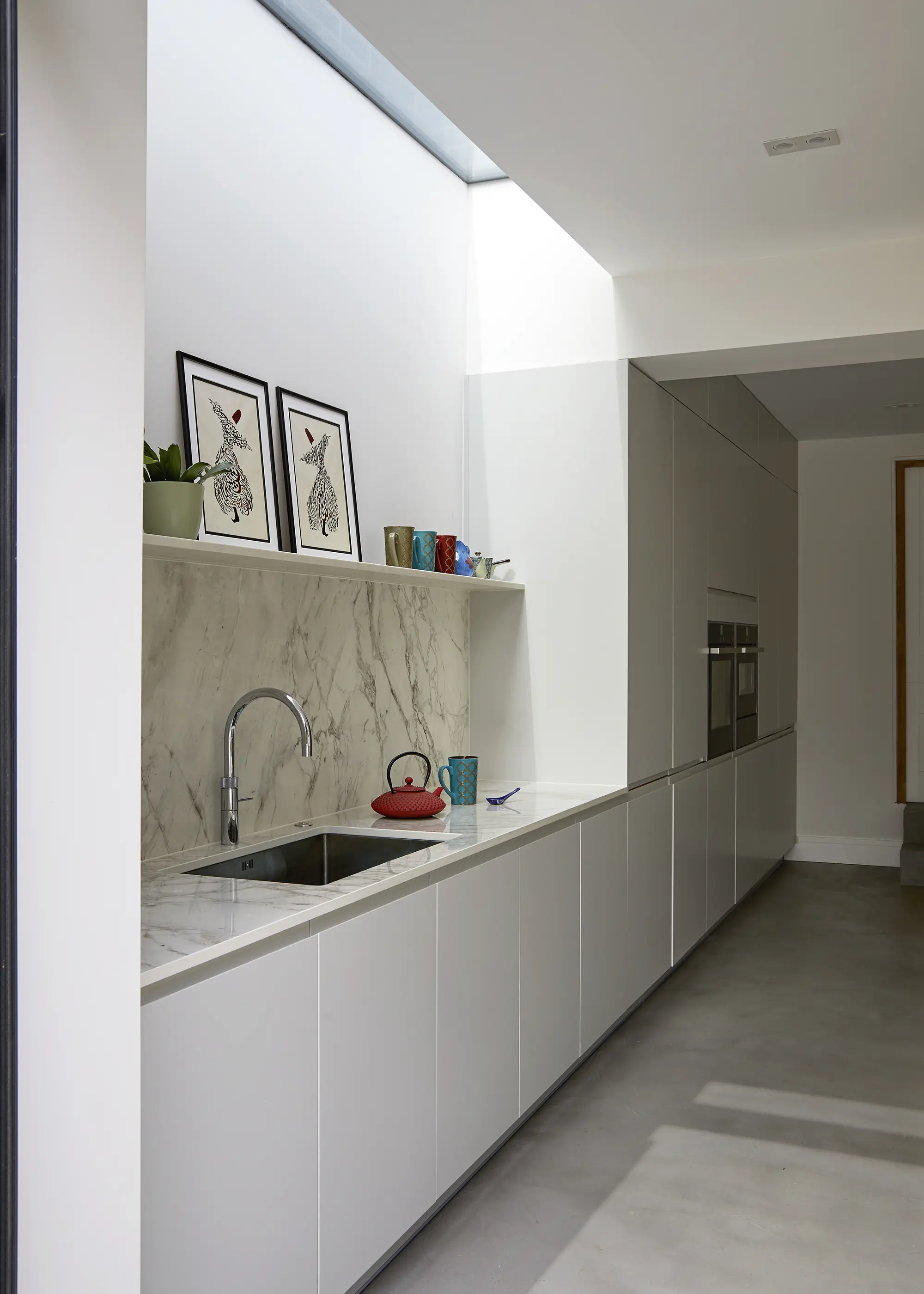 CLOSER LOOK Glazing featuresIntroducing natural light into the interior was key to the design of the kitchen. Rather than a bank of bifold doors and conventional skylights in the south-facing room, an oriel picture window was chosen that has a small section of horizontal glazing at the top edge, with a single door – with fanlight above and sidelight – giving access onto the paved garden. These illuminate the dining area, while a thin skylight in a recess above the sink provides daylight in the kitchen without causing overheating. |