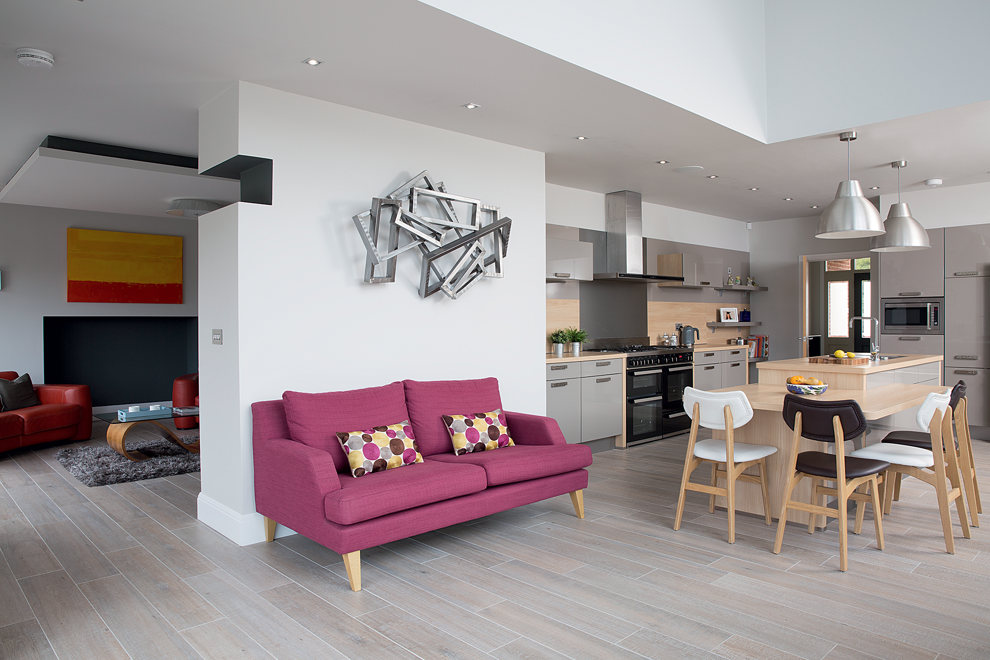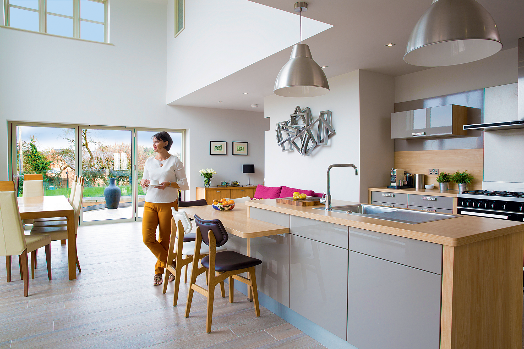 Despite this blow, the project had to get back on track. The modern edge runs into the internal decor, furniture and fittings. The kitchen was the biggest challenge. The couple knew early on that they wanted a central island and plenty of storage, but most of the kitchens they really liked were way over their allocated budget.