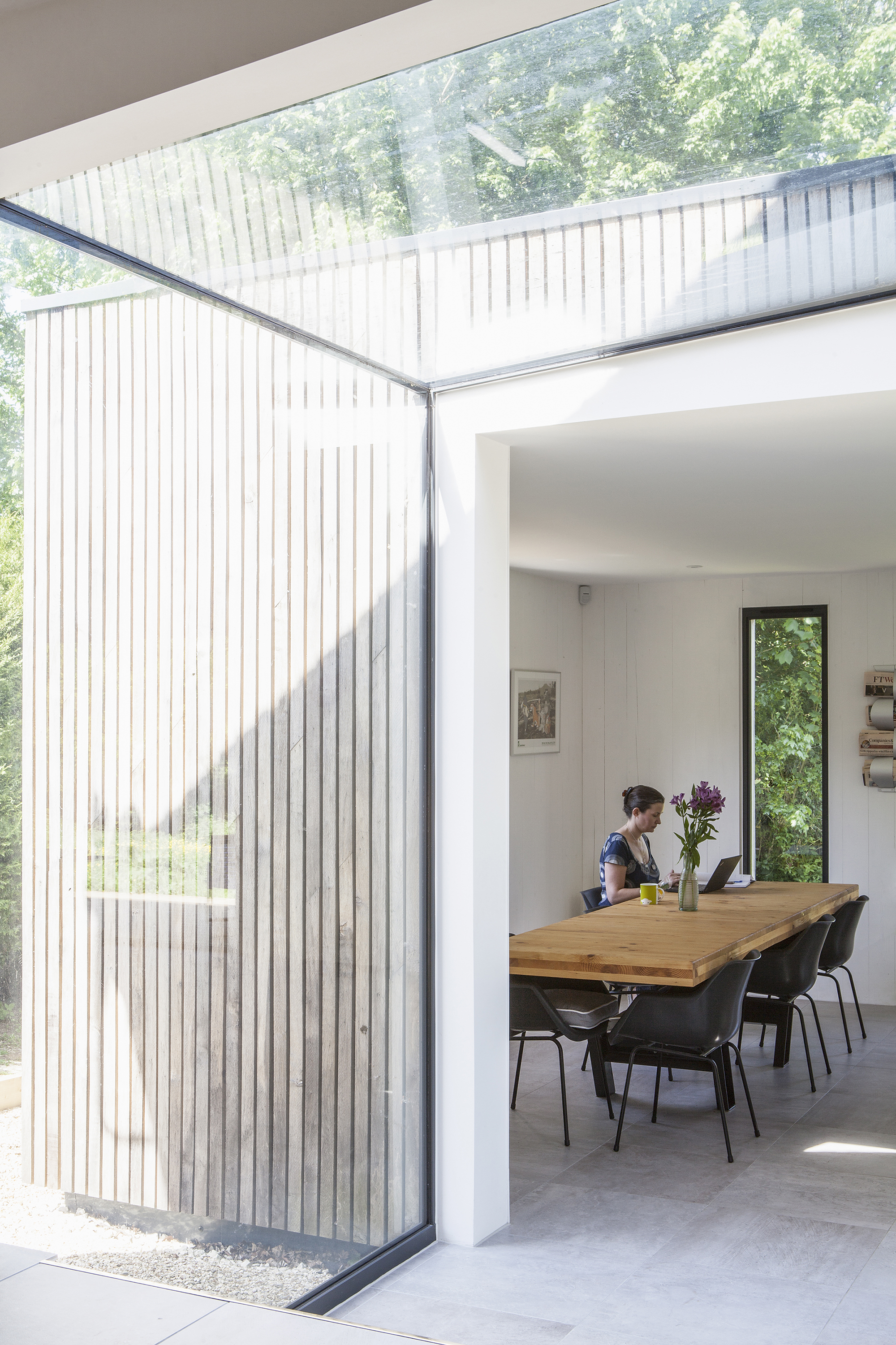 The extension has been clad in English oak boards sourced from Vastern Timber. The couple knew that the timber would weather to a beautiful silver colour over time, helping the building to blend seamlessly into the wooded setting.