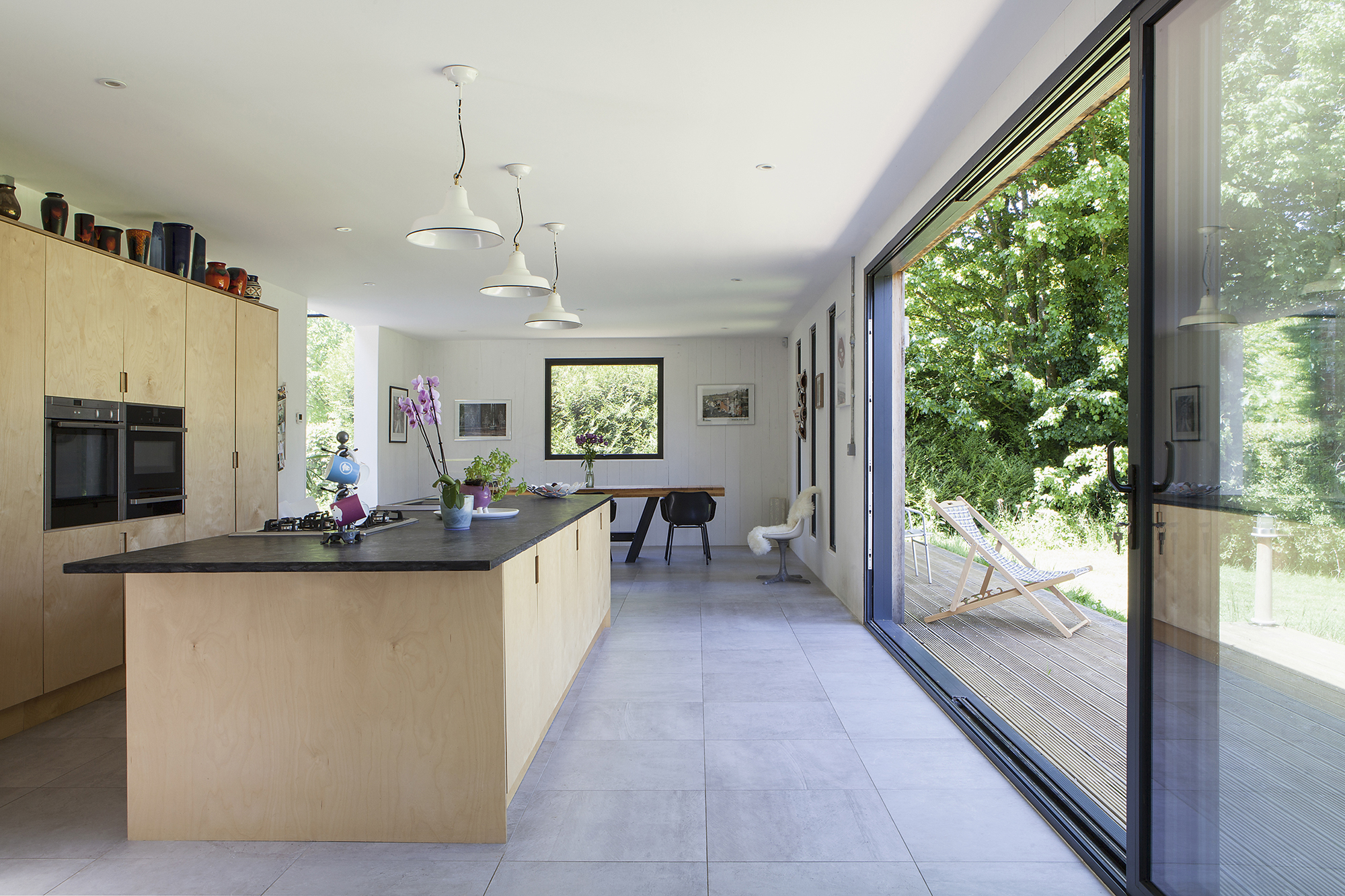 As the extension forms such a contemporary-looking addition to the original barn from the exterior, the Chambers were keen to continue this theme inside. The structure houses an open-plan kitchen-diner, plus a casual seating area that’s delineated by a partial wall.