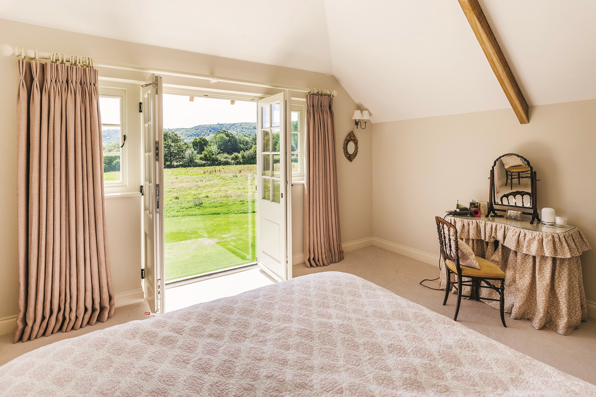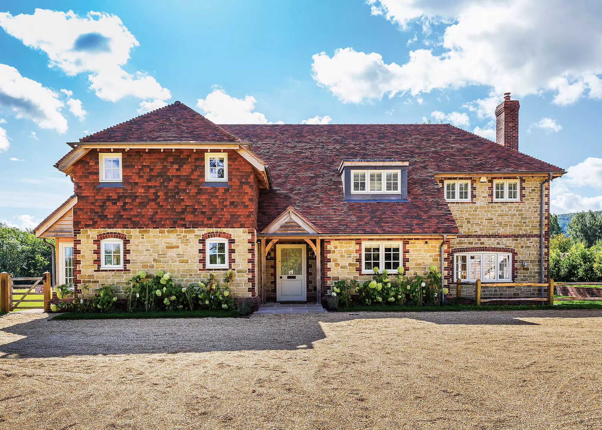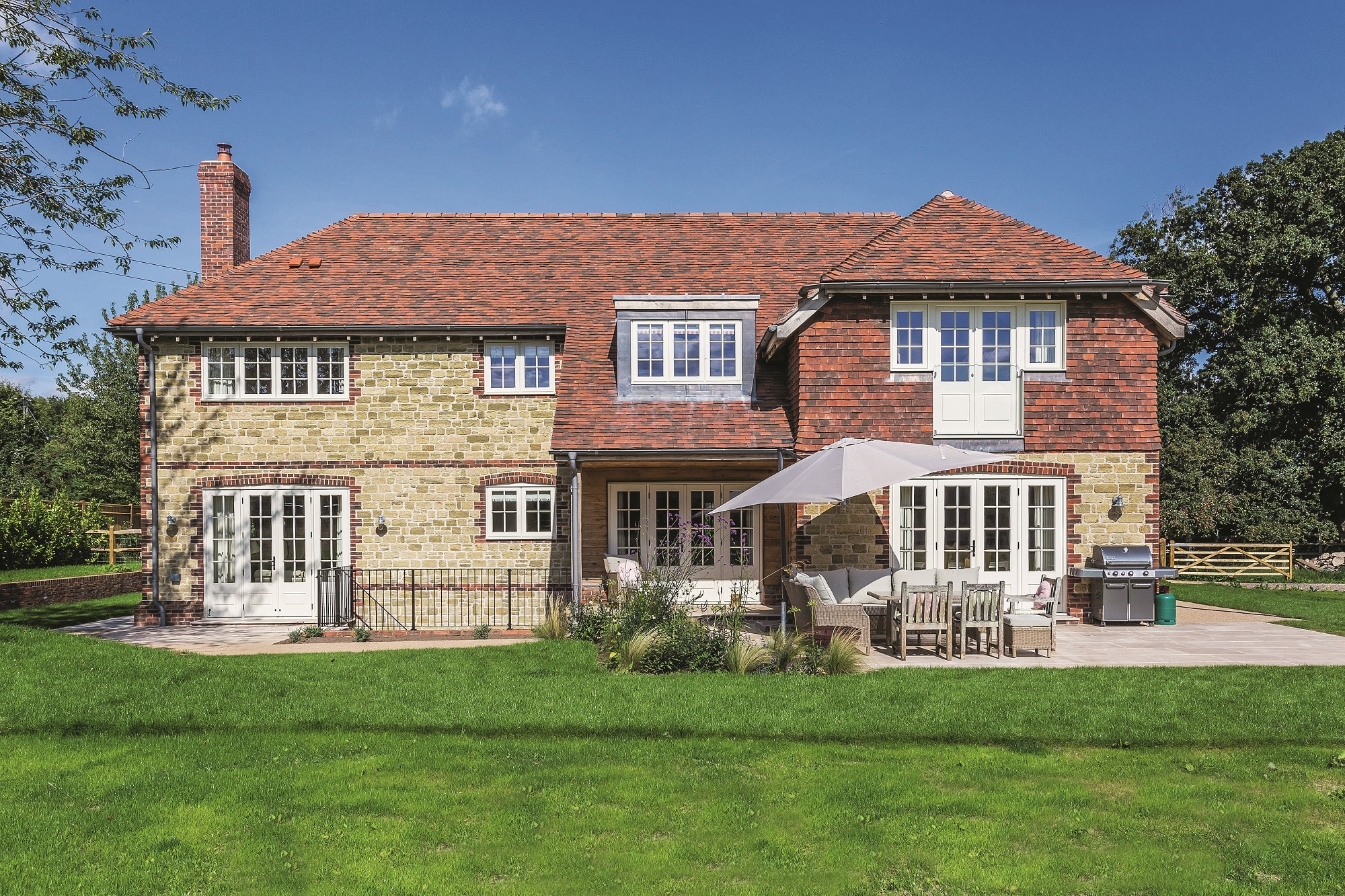 Once the timber frame structure was erected, it was clad in stone sourced from a local quarry so the house would blend seamlessly with the local architecture. To complete the traditional aesthetic, the roof was topped with clay tiles. Double-glazed timber casement windows with decorative glazing bars were fitted throughout.