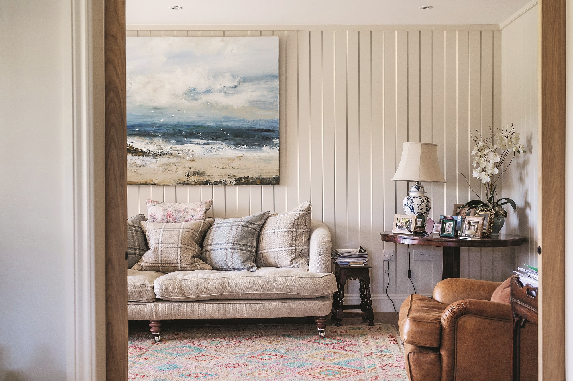 Sarah’s favourite place to spend time is in the snug, just off the kitchen-breakfast room. “The pocket doors in there are pretty much always open, but it’s still a lovely cosy space,” she says. “Jonathan loves sitting outside on the terrace, just looking out at the view.”