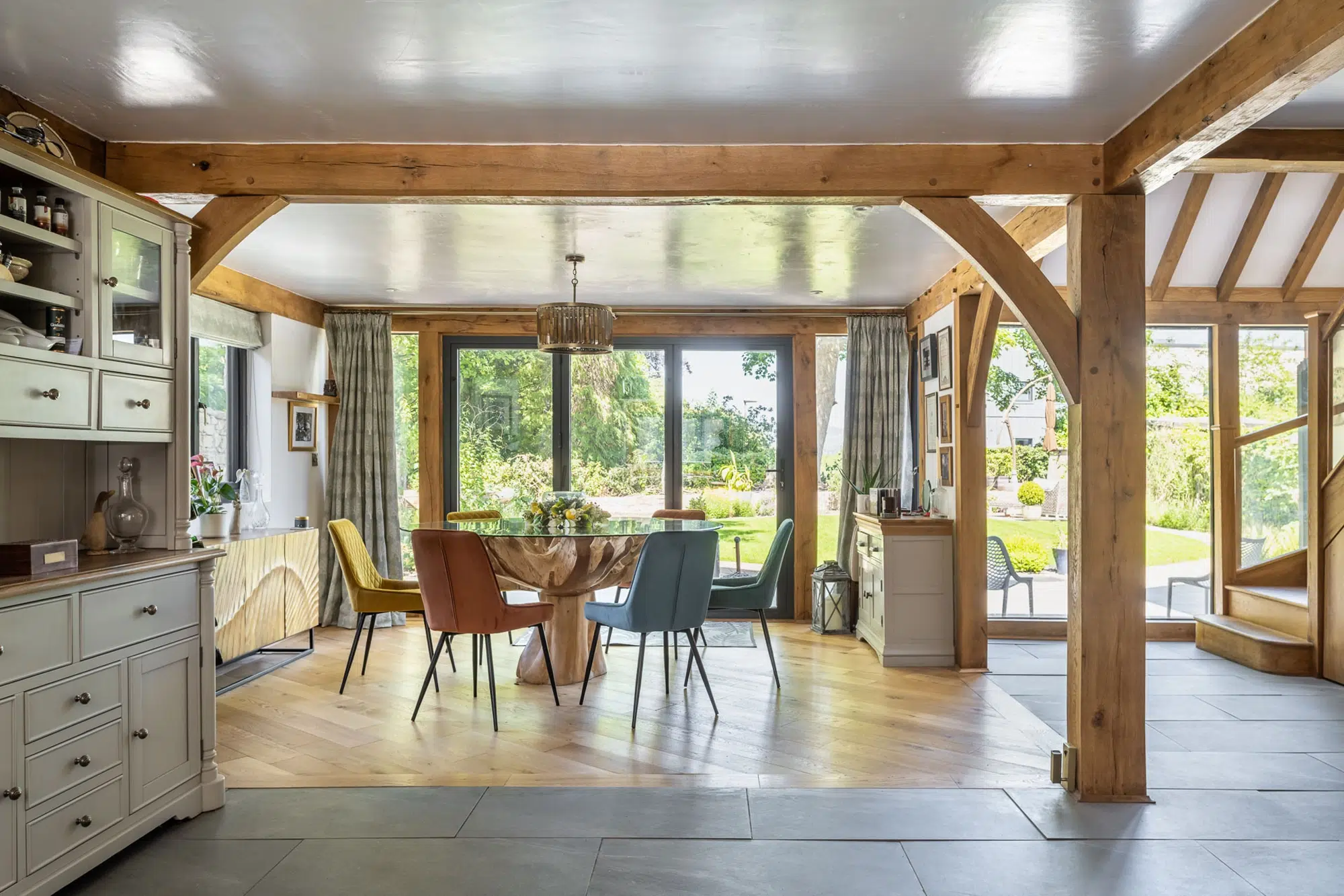 The open-plan space is zoned by the post and beam structure and the visual mix of slate and wood flooring from R M Jones Joinery