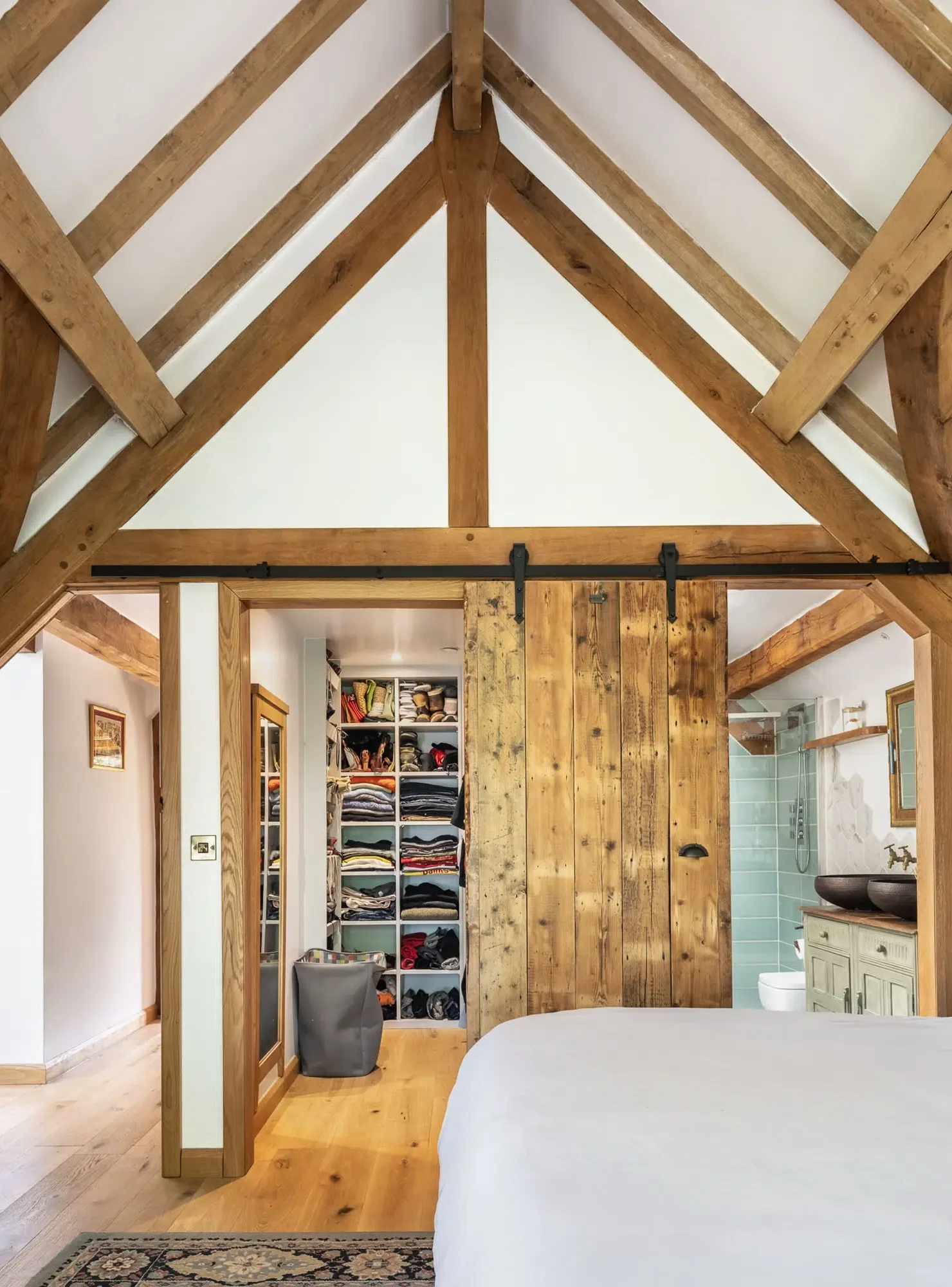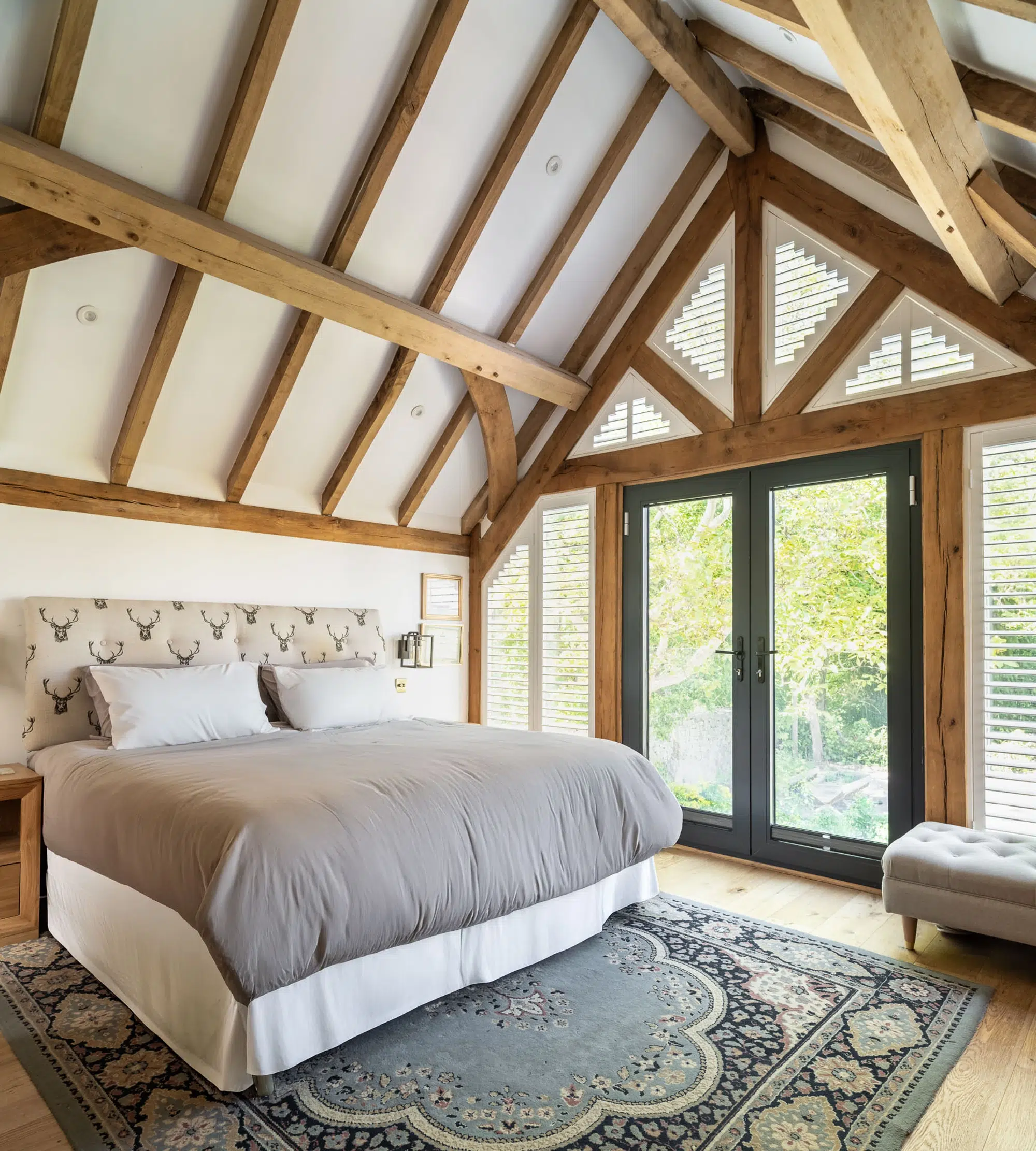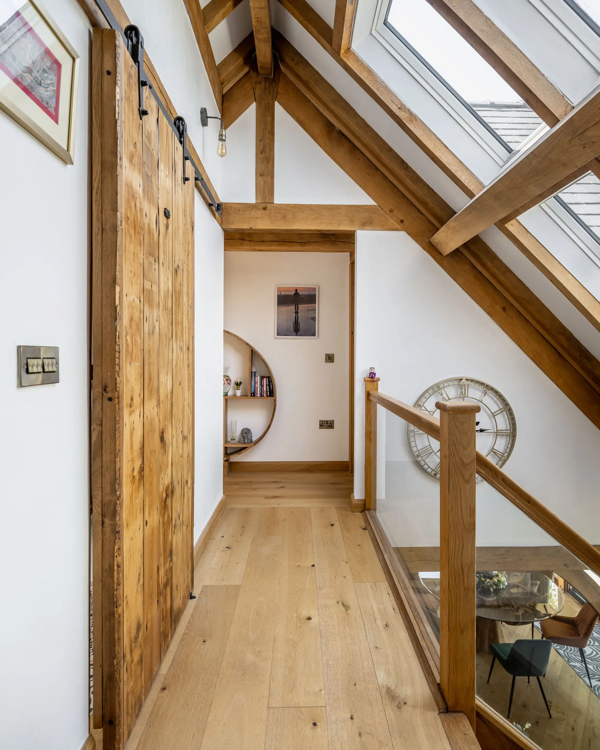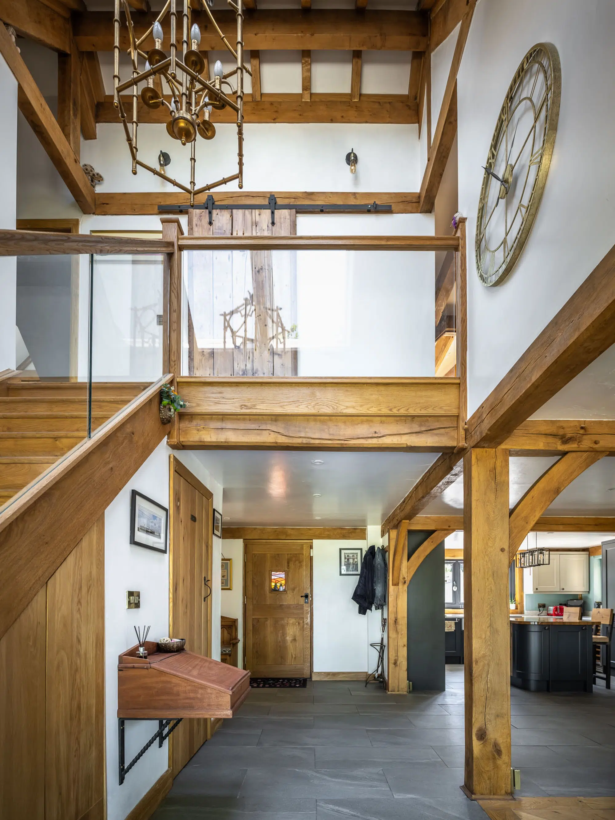 The roof is a hybrid of oak and softwood to make a focal point of the oak frame in key living spaces. This method of construction is a useful way to keep the costs down in oak frame building