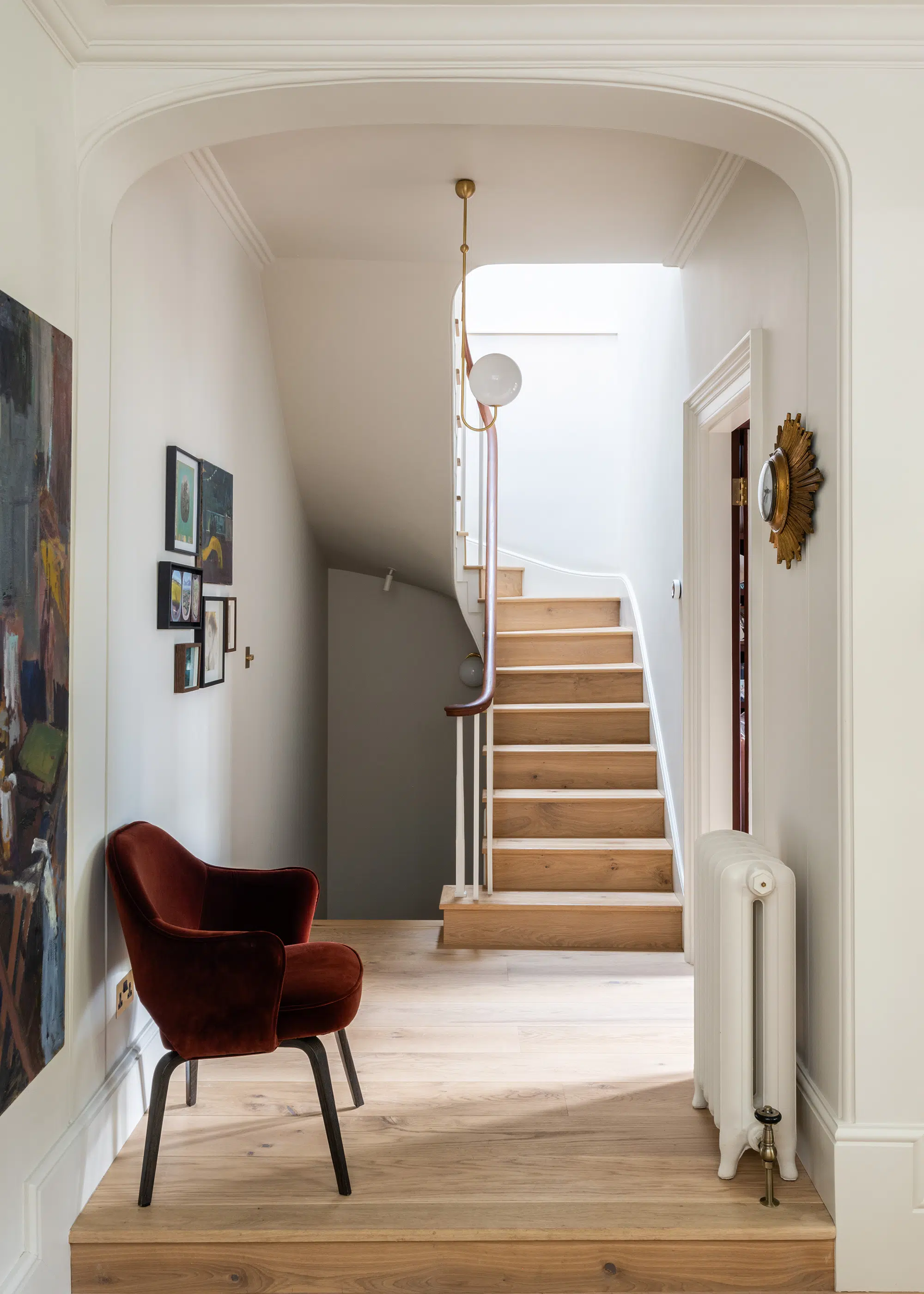 The master bedroom on the upper level has been fully refurbished with new Russwood oak flooring laid. The period features have been restored and re-decorated. Nicole chose the earthy colour palette to create a tranquil feel.