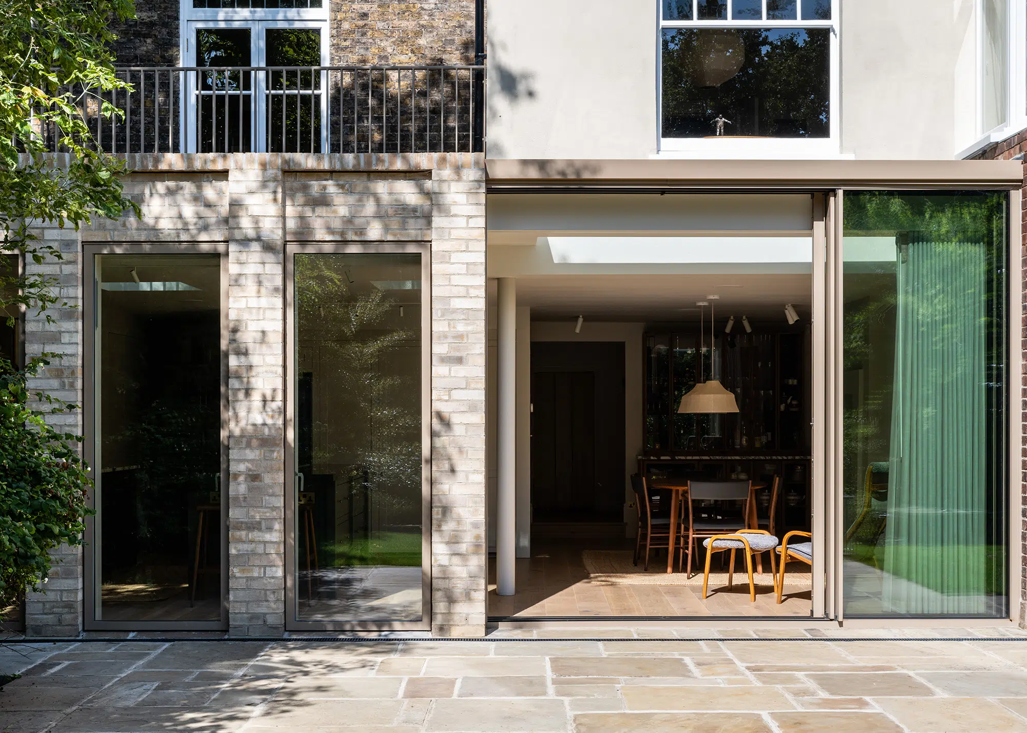 The final design was for a new extension at lower ground level that would bring cohesion to the back of the building. Split into two distinct elements to reflect the tripartite styles of the rear elevation, the new extension features floor to ceiling sliding doors to the dining area and three vertical slot windows to the kitchen, set between brick piers. Rooflights have been introduced into a former balcony, acting as a lightwell above the kitchen.