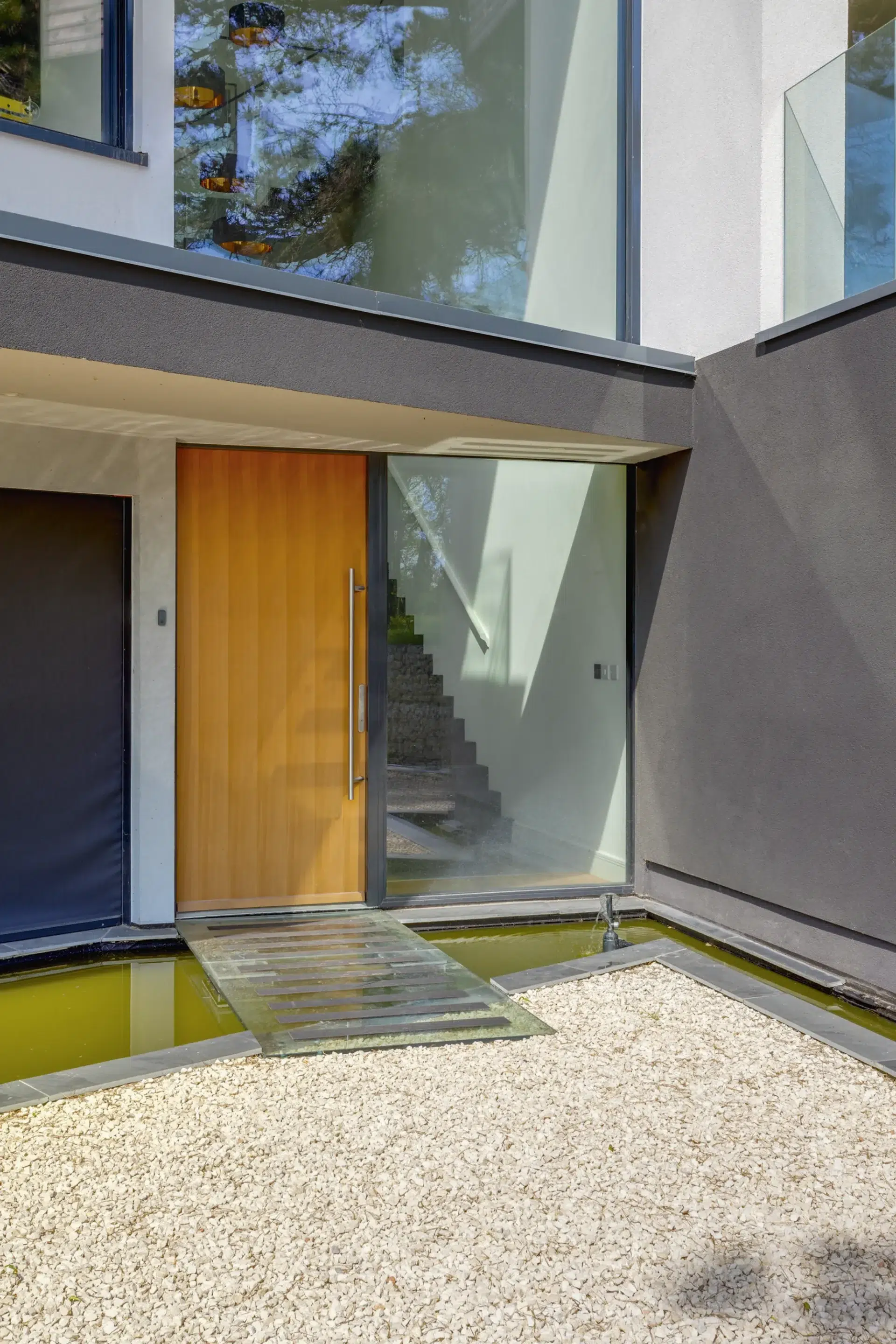 The north-facing back of the house has smaller windows to those at the front. A central section of timber cladding breaks up the rendered facade