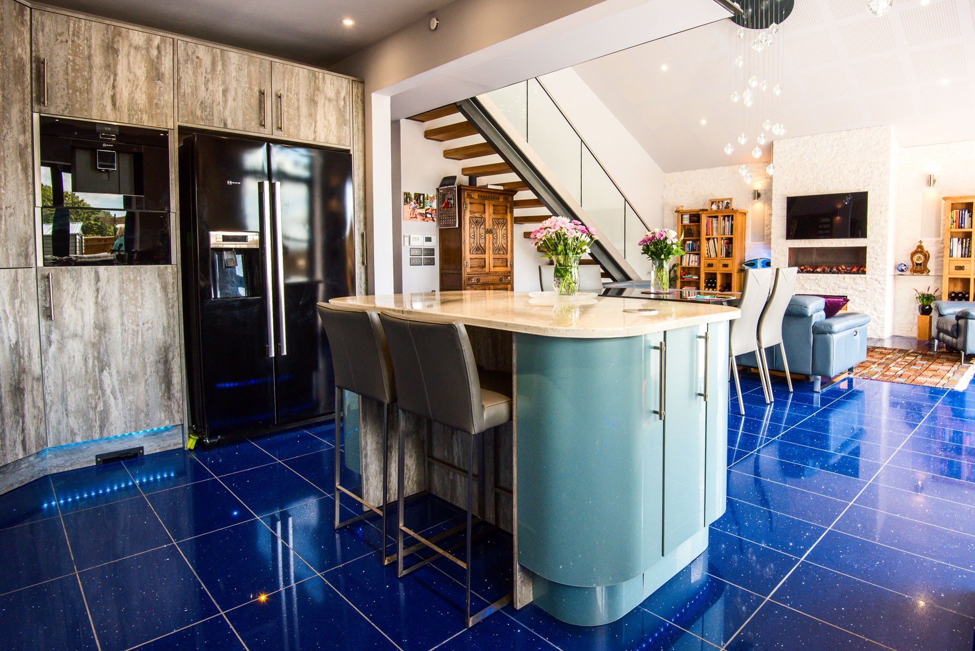 In the open-plan living area, glass ball lights and blue quartz floors combine to create a starry effect. “On a sunny day, you get little rainbows everywhere,” says Olwen. “It’s beautiful.”