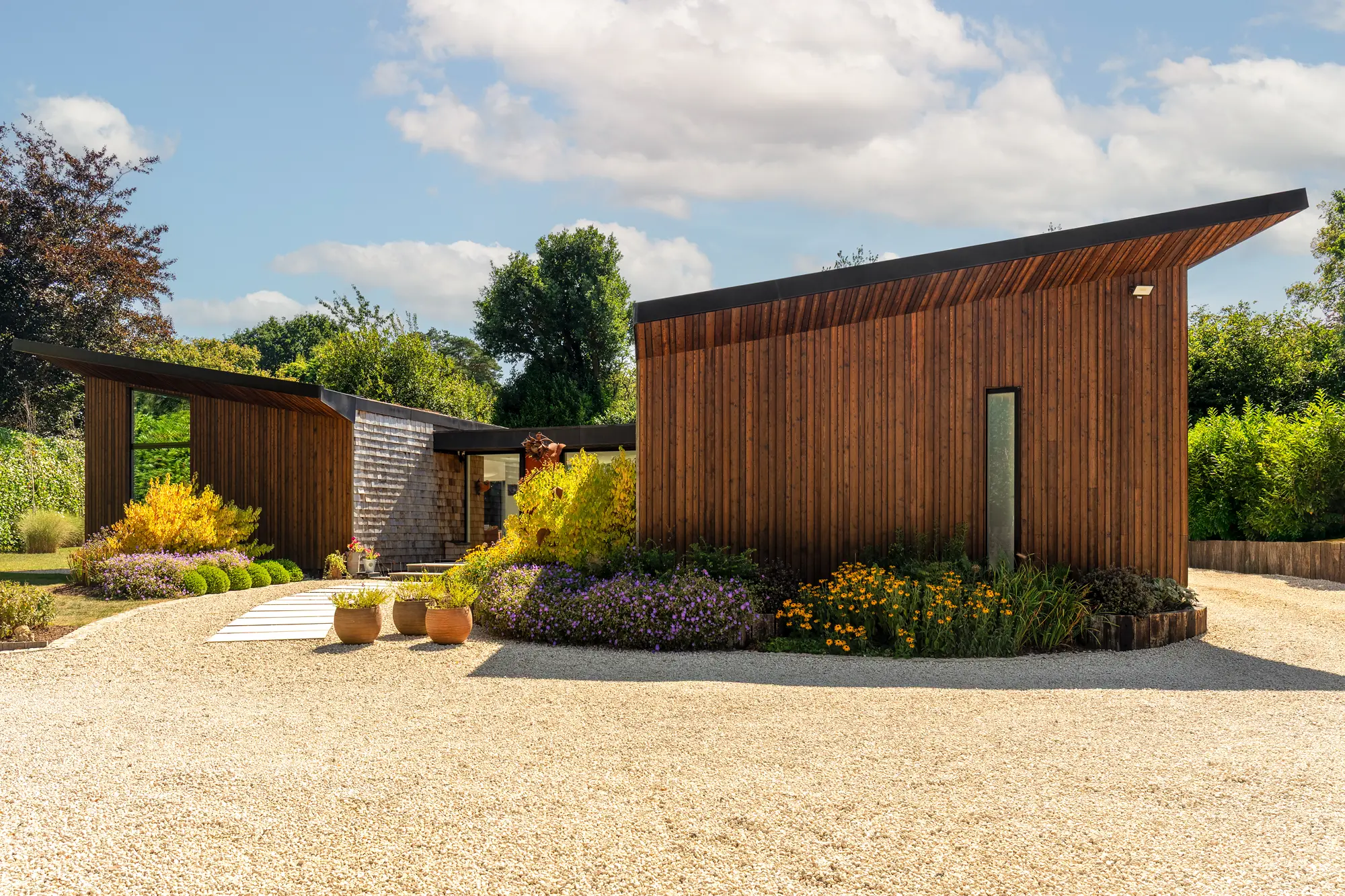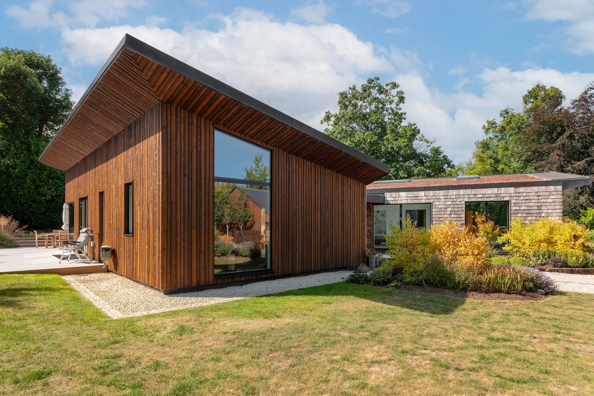 The mix of cladding looks striking, with vertical boards (also featuring under the overhanging roof) on each of the wings. Tiled cedar shingles on the central section works to give the appearance of two rectangles being pulled apart to expose a core