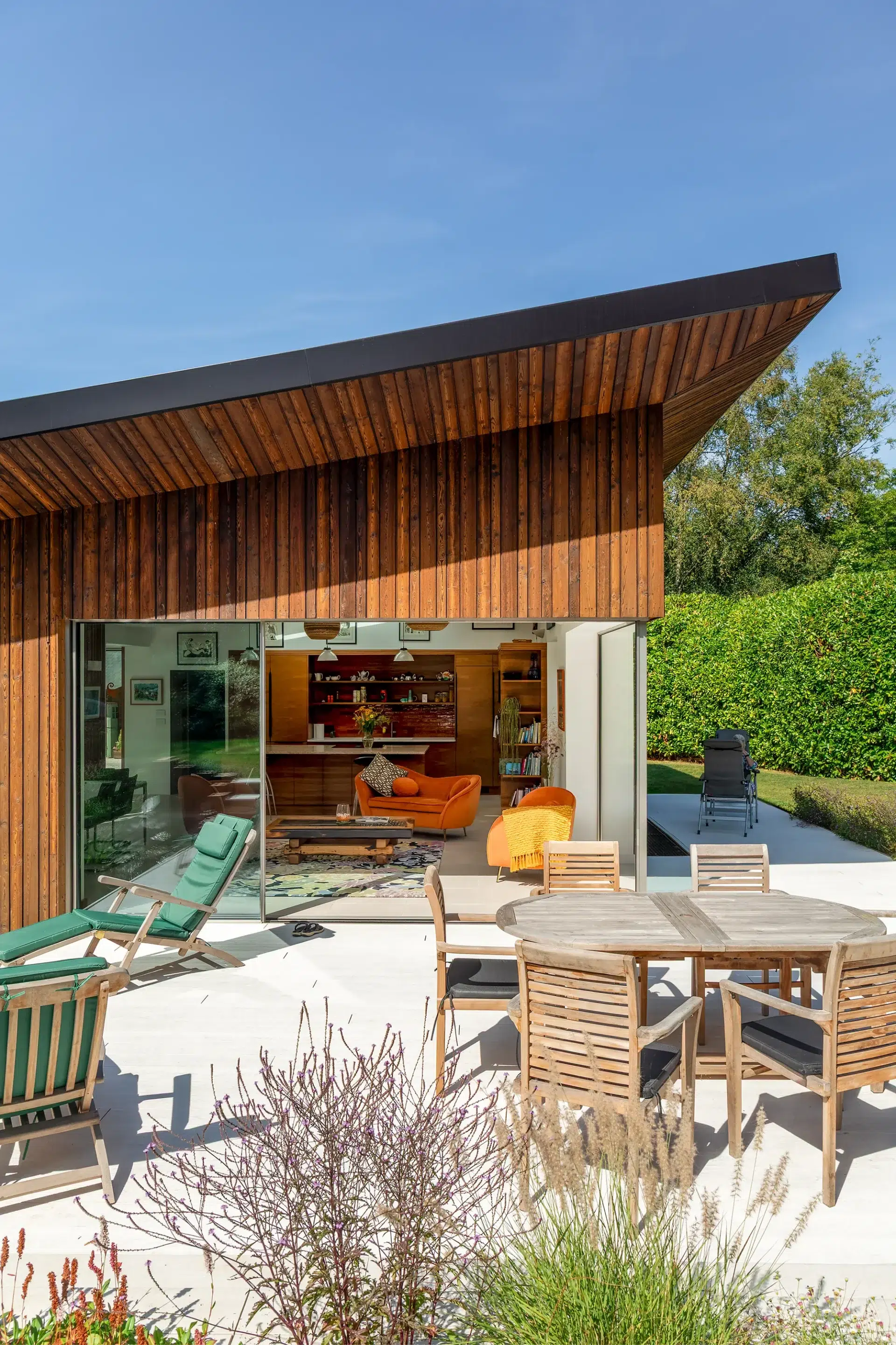 Glazed sliding doors pull away from the corner space, maximising garden views and the indoor-outdoor connection