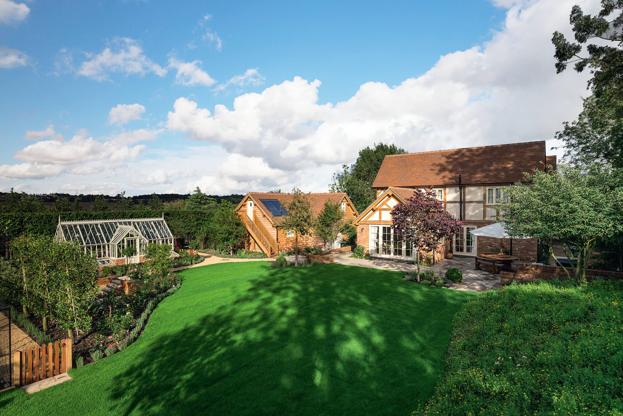 The building’s fabric is a mix of structural insulated panels (SIPs) on the ground floor – which took just a week to construct – and oak frame above (which spans across the SIPs and outer brick wall). There’s a garage and annexe adjacent to the house (perfect for housing visitors), plus a potting shed, greenhouse and other outbuildings, all erected as part of the same package of works.