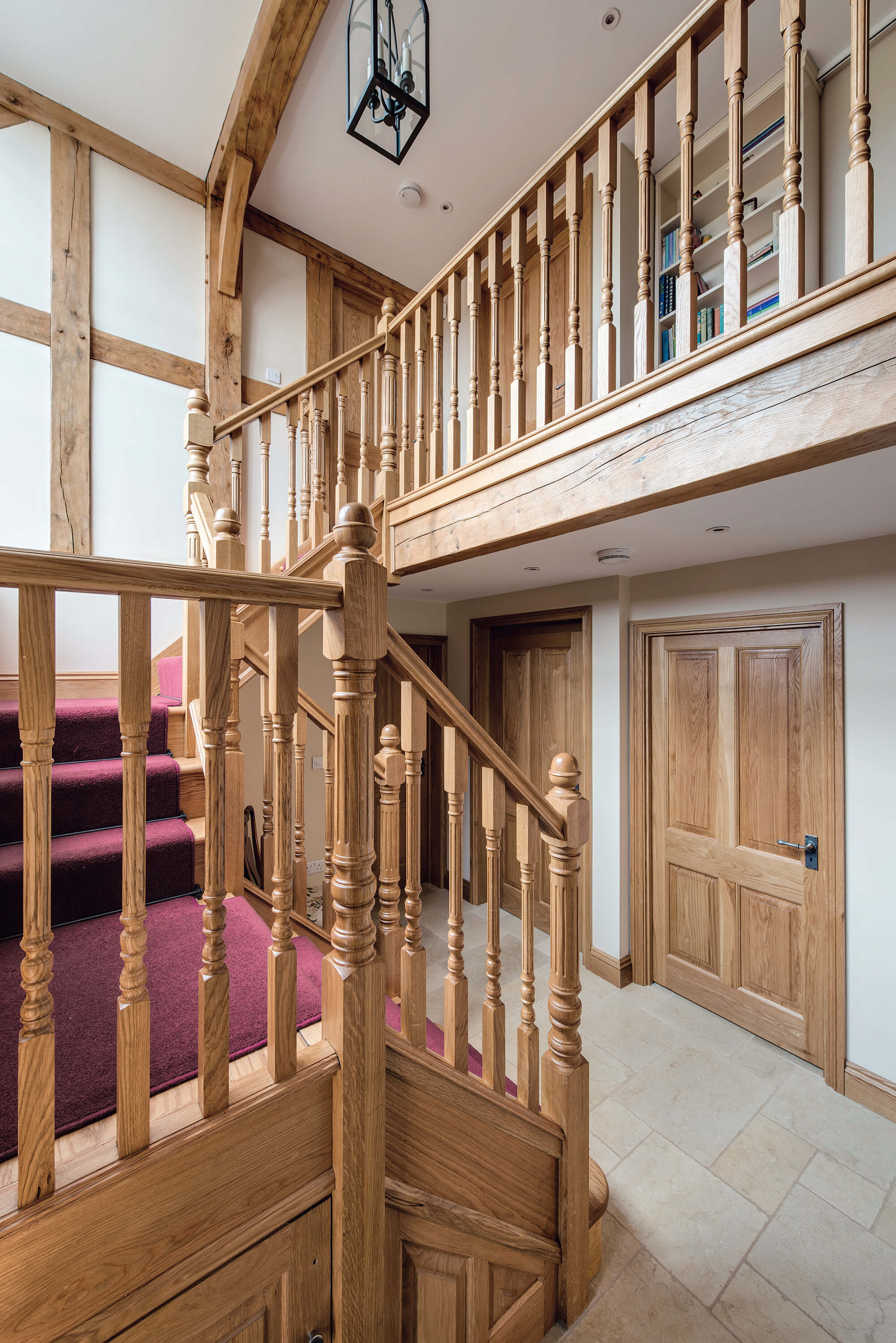 Upstairs there are three bedrooms – one of which contains a comprehensive home gym, for which the floor had to be reinforced to take the extra loads of this kind of zone. The master bedroom is open to the eaves to show off the exposed oak beams, but the roof space above the two other bedrooms has been given over to loft storage, which is accessed via a ‘hidden’ sliding door disguised as a bookshelf.