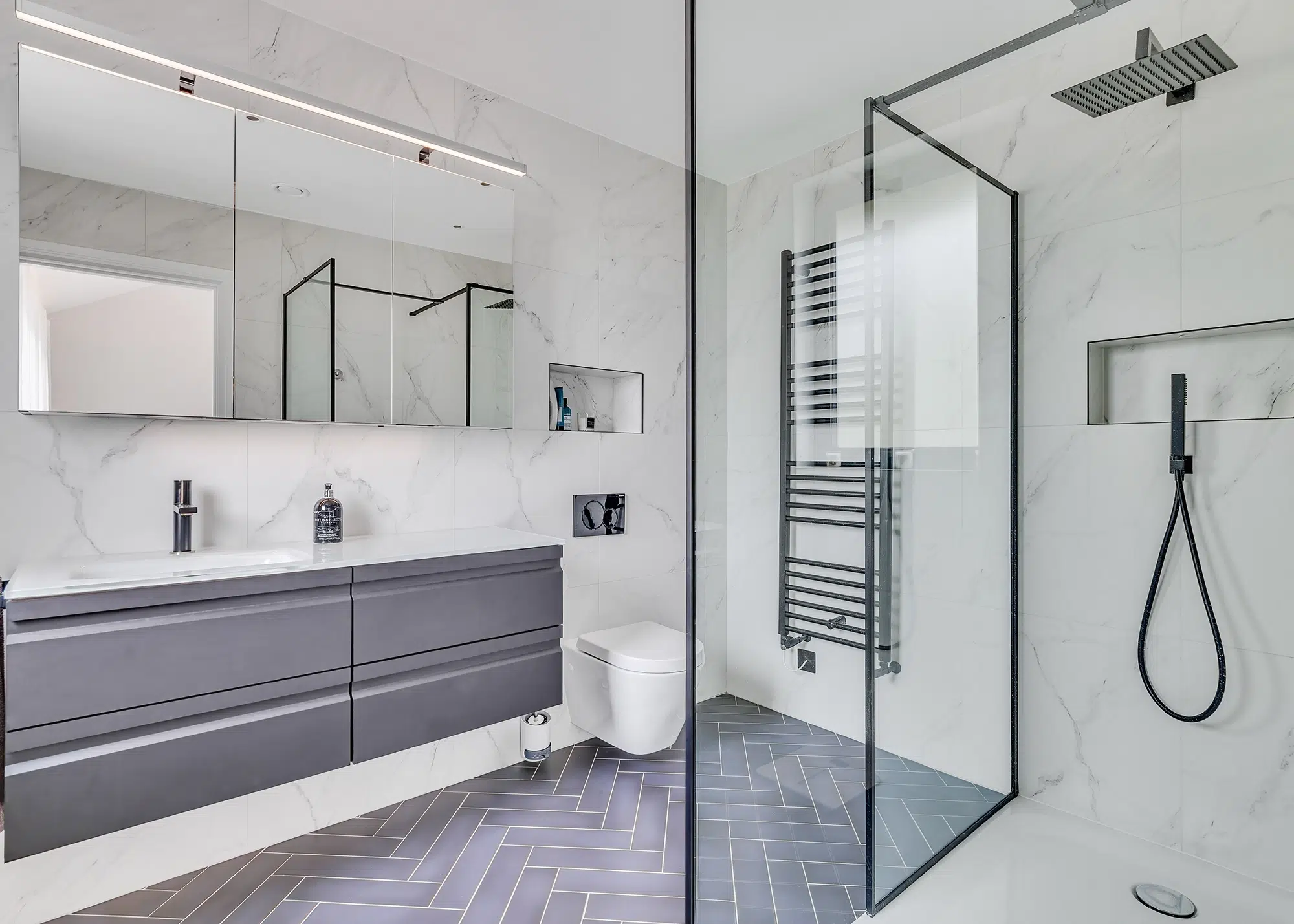Despite the challenges, the project progressed steadily and the couple mostly managed to avoid materials shortages and price hikes caused by the pandemic. Although, hold-ups on the Suez Canal meant making new choices. “We couldn’t source black factory-painted doors anywhere in the UK so we painted white ones on site instead,” says Sophie. “I also wanted grey bricks around the external base plinth but compromised with red, which I don’t notice now.”