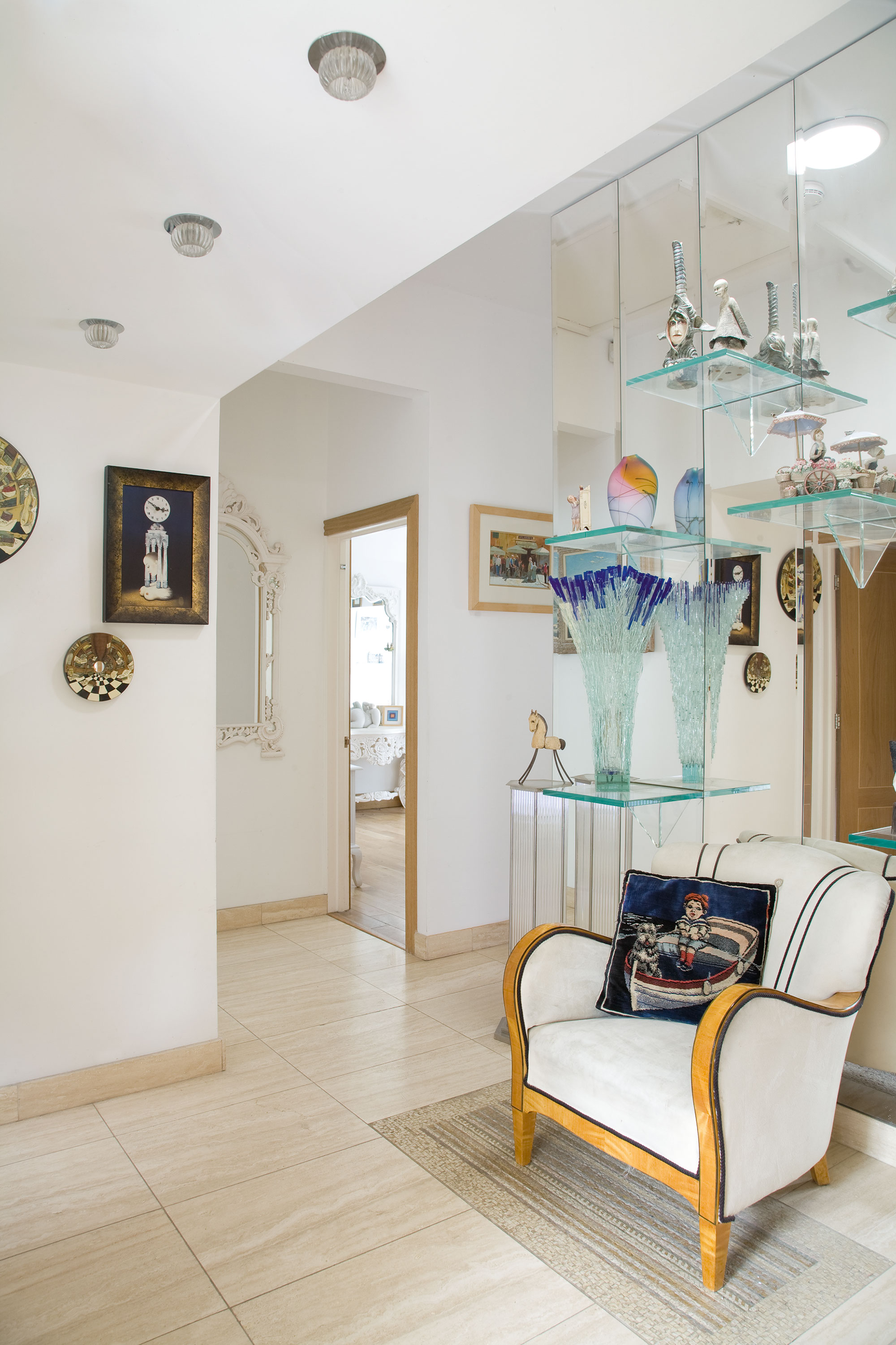 The bespoke kitchen was designed with an art deco theme in mind, with painted wooden units and glass cabinets to display Dorienne’s collection of china, glassware and ceramics.