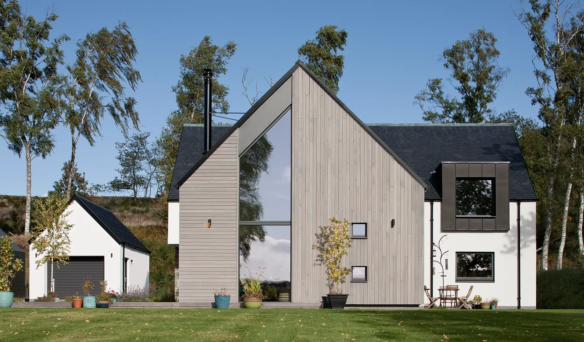 The final scheme presented a one-and-three-quarter-storey design. Outside, the style of the house is a nod towards the character of buildings local to the particular area of Aberdeenshire. “The simple palette of external materials reflects the vernacular style, but with a modern twist,” says Finlay. “On approach, you are welcomed by the eye-catching pitched Siberian larch-clad gable with full-height glazed detailing. The use of timber cladding and black corrugated roofing materials provides a link to the barn-style buildings that are familiar to the area.”